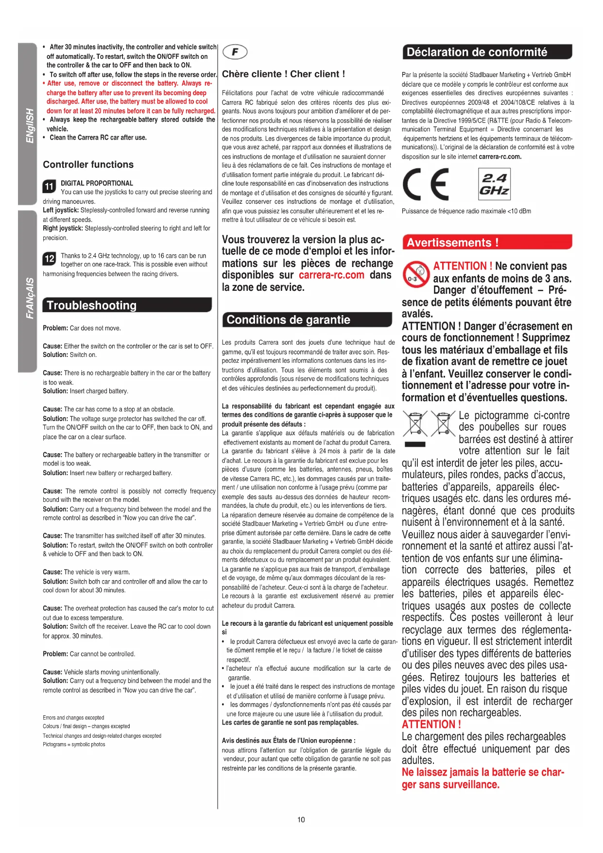 Thanks to 2.4 GHz technology, up to 16 cars can be run together on one race-track. This is possible even without harmonising frequencies between the racing drivers. Troubleshooting Problem: Car does not move. Cause: Either the switch on the controller or the car is set to OFF. Solution: Switch on. Cause: There is no rechargeable battery in the car or the battery is too weak. Solution: Insert charged battery. Cause: The car has come to a stop at an obstacle. Solution: The voltage surge protector has switched the car off. Turn the ON/OFF switch on the car to OFF, then back to ON, and place the car on a clear surface. Cause: The battery or rechargeable battery in the transmitter or model is too weak. Solution: Insert new battery or recharged battery. Cause: The remote control is possibly not correctly frequency bound with the receiver on the model. Solution: Carry out a frequency bind between the model and the remote control as described in “Now you can drive the car”. Cause: The transmitter has switched itself off after 30 minutes. Solution: To restart, switch the ON/OFF switch on both controller & vehicle to OFF and then back to ON. Cause: The vehicle is very warm. Solution: Switch both car and controller off and allow the car to cool down for about 30 minutes. Cause: The overheat protection has caused the car’s motor to cut out due to excess temperature. Solution: Switch off the receiver. Leave the RC car to cool down for approx. 30 minutes. Problem: Car cannot be controlled. Cause: Vehicle starts moving unintentionally. Solution: Carry out a frequency bind between the model and the remote control as described in “Now you can drive the car”. Errors and changes excepted Colours / final design – changes excepted Technical changes and design-related changes excepted Pictograms = symbolic photos Chère cliente ! Cher client ! Félicitations pour l’achat de votre véhicule radiocommandé Carrera RC fabriqué selon des critères récents des plus exi- geants. Nous avons toujours pour ambition d’améliorer et de per- fectionner nos produits et nous réservons la possibilité de réaliser des modifications techniques relatives à la présentation et design de nos produits. Les divergences de faible importance du produit, que vous avez acheté, par rapport aux données et illustrations de ces instructions de montage et d’utilisation ne sauraient donner lieu à des réclamations de ce fait. Ces instructions de montage et d’utilisation forment partie intégrale du produit. Le fabricant dé- cline toute responsabilité en cas d’inobservation des instructions de montage et d’utilisation et des consignes de sécurité y figurant. Veuillez conserver ces instructions de montage et d’utilisation, afin que vous puissiez les consulter ultérieurement et et les re- mettre à tout utilisateur de ce véhicule si besoin est. Vous trouverez la version la plus ac- tuelle de ce mode d‘emploi et les infor- mations sur les pièces de rechange disponibles sur carrera-rc.com dans la zone de service. Conditions de garantie Les produits Carrera sont des jouets d’une technique haut de gamme, qu’il est toujours recommandé de traiter avec soin. Res- pectez impérativement les informations contenues dans les ins- tructions d’utilisation. Tous les éléments sont soumis à des contrôles approfondis (sous réserve de modifications techniques et des véhicules destinées au perfectionnement du produit). La responsabilité du fabricant est cependant engagée aux termes des conditions de garantie ci-après à supposer que le produit présente des défauts : La garantie s’applique aux défauts matériels ou de fabrication effectivement existants au moment de l’achat du produit Carrera. La garantie du fabricant s’élève à 24 mois à partir de la date d’achat. Le recours à la garantie du fabricant est exclue pour les pièces d’usure (comme les batteries, antennes, pneus, boîtes de vitesse Carrera RC, etc.), les dommages causés par un traite- ment / une utilisation non conforme à l’usage prévu (comme par exemple des sauts au-dessus des données de hauteur recom- mandées, la chute du produit, etc.) ou les interventions de tiers. La réparation demeure réservée au domaine de compétence de la société Stadlbauer Marketing + Vertrieb GmbH ou d’une entre- prise dûment autorisée par cette dernière. Dans le cadre de cette garantie, la société Stadlbauer Marketing + Vertrieb GmbH décide au choix du remplacement du produit Carrera complet ou des élé- ments défectueux ou du remplacement par un produit équivalent. La garantie ne s’applique pas aux frais de transport, d’emballage et de voyage, de même qu’aux dommages découlant de la res- ponsabilité de l’acheteur. Ceux-ci sont à la charge de l’acheteur. Le recours à la garantie est exclusivement réservé au premier acheteur du produit Carrera. Le recours à la garantie du fabricant est uniquement possible