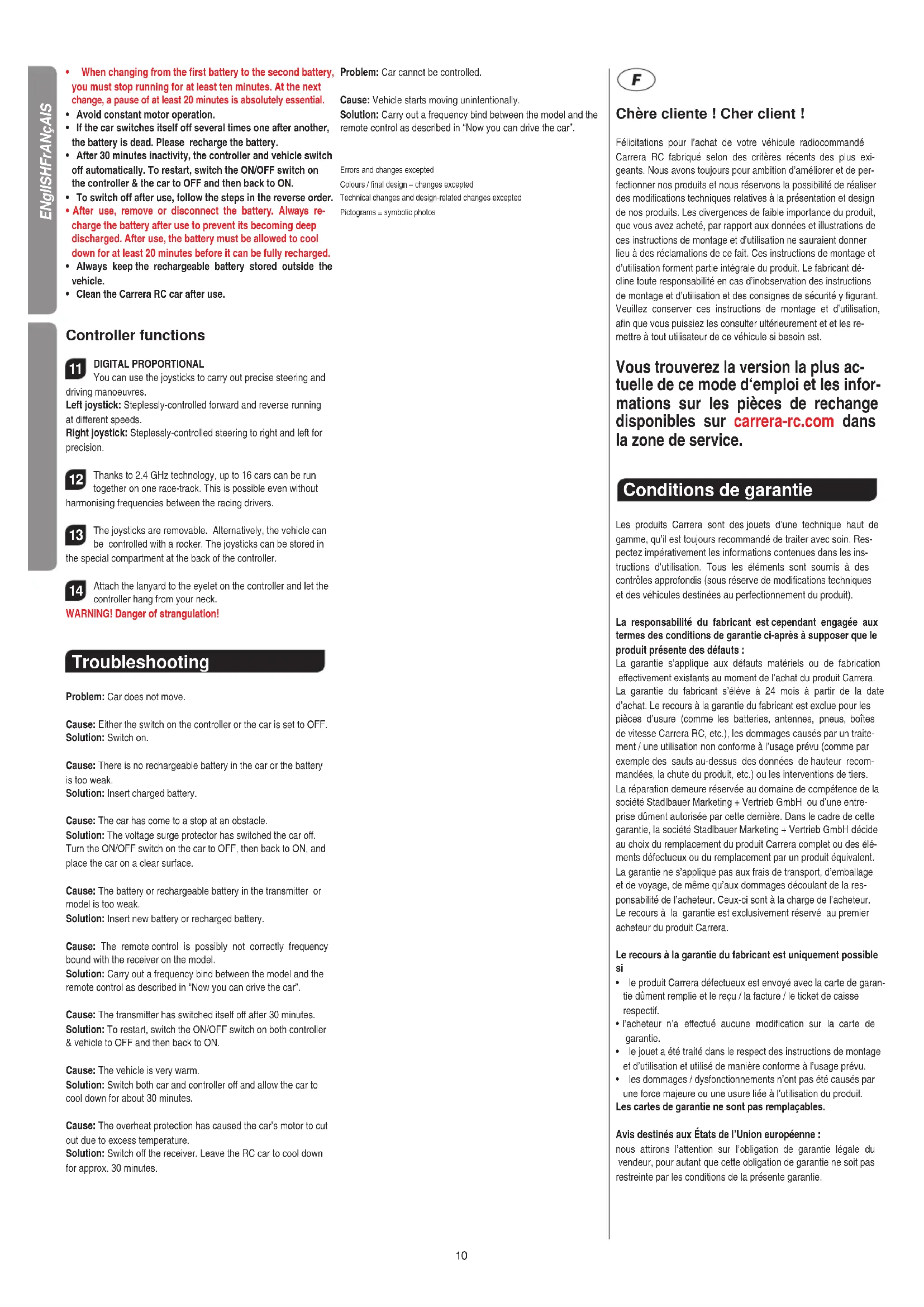 Attach the lanyard to the eyelet on the controller and let the controller hang from your neck. WARNING! Danger of strangulation! Troubleshooting Problem: Car does not move. Cause: Either the switch on the controller or the car is set to OFF. Solution: Switch on. Cause: There is no rechargeable battery in the car or the battery is too weak. Solution: Insert charged battery. Cause: The car has come to a stop at an obstacle. Solution: The voltage surge protector has switched the car off. Turn the ON/OFF switch on the car to OFF, then back to ON, and place the car on a clear surface. Cause: The battery or rechargeable battery in the transmitter or model is too weak. Solution: Insert new battery or recharged battery. Cause: The remote control is possibly not correctly frequency bound with the receiver on the model. Solution: Carry out a frequency bind between the model and the remote control as described in “Now you can drive the car”. Cause: The transmitter has switched itself off after 30 minutes. Solution: To restart, switch the ON/OFF switch on both controller & vehicle to OFF and then back to ON. Cause: The vehicle is very warm. Solution: Switch both car and controller off and allow the car to cool down for about 30 minutes. Cause: The overheat protection has caused the car’s motor to cut out due to excess temperature. Solution: Switch off the receiver. Leave the RC car to cool down for approx. 30 minutes. Problem: Car cannot be controlled. Cause: Vehicle starts moving unintentionally. Solution: Carry out a frequency bind between the model and the remote control as described in “Now you can drive the car”. Errors and changes excepted Colours / final design – changes excepted Technical changes and design-related changes excepted Pictograms = symbolic photos Chère cliente ! Cher client ! Félicitations pour l’achat de votre véhicule radiocommandé Carrera RC fabriqué selon des critères récents des plus exi- geants. Nous avons toujours pour ambition d’améliorer et de per- fectionner nos produits et nous réservons la possibilité de réaliser des modifications techniques relatives à la présentation et design de nos produits. Les divergences de faible importance du produit, que vous avez acheté, par rapport aux données et illustrations de ces instructions de montage et d’utilisation ne sauraient donner lieu à des réclamations de ce fait. Ces instructions de montage et d’utilisation forment partie intégrale du produit. Le fabricant dé- cline toute responsabilité en cas d’inobservation des instructions de montage et d’utilisation et des consignes de sécurité y figurant. Veuillez conserver ces instructions de montage et d’utilisation, afin que vous puissiez les consulter ultérieurement et et les re- mettre à tout utilisateur de ce véhicule si besoin est. Vous trouverez la version la plus ac- tuelle de ce mode d‘emploi et les infor- mations sur les pièces de rechange disponibles sur carrera-rc.com dans la zone de service. Conditions de garantie Les produits Carrera sont des jouets d’une technique haut de gamme, qu’il est toujours recommandé de traiter avec soin. Res- pectez impérativement les informations contenues dans les ins- tructions d’utilisation. Tous les éléments sont soumis à des contrôles approfondis (sous réserve de modifications techniques et des véhicules destinées au perfectionnement du produit). La responsabilité du fabricant est cependant engagée aux termes des conditions de garantie ci-après à supposer que le produit présente des défauts : La garantie s’applique aux défauts matériels ou de fabrication effectivement existants au moment de l’achat du produit Carrera. La garantie du fabricant s’élève à 24 mois à partir de la date d’achat. Le recours à la garantie du fabricant est exclue pour les pièces d’usure (comme les batteries, antennes, pneus, boîtes de vitesse Carrera RC, etc.), les dommages causés par un traite- ment / une utilisation non conforme à l’usage prévu (comme par exemple des sauts au-dessus des données de hauteur recom- mandées, la chute du produit, etc.) ou les interventions de tiers. La réparation demeure réservée au domaine de compétence de la société Stadlbauer Marketing + Vertrieb GmbH ou d’une entre- prise dûment autorisée par cette dernière. Dans le cadre de cette garantie, la société Stadlbauer Marketing + Vertrieb GmbH décide au choix du remplacement du produit Carrera complet ou des élé- ments défectueux ou du remplacement par un produit équivalent. La garantie ne s’applique pas aux frais de transport, d’emballage et de voyage, de même qu’aux dommages découlant de la res- ponsabilité de l’acheteur. Ceux-ci sont à la charge de l’acheteur. Le recours à la garantie est exclusivement réservé au premier acheteur du produit Carrera. Le recours à la garantie du fabricant est uniquement possible