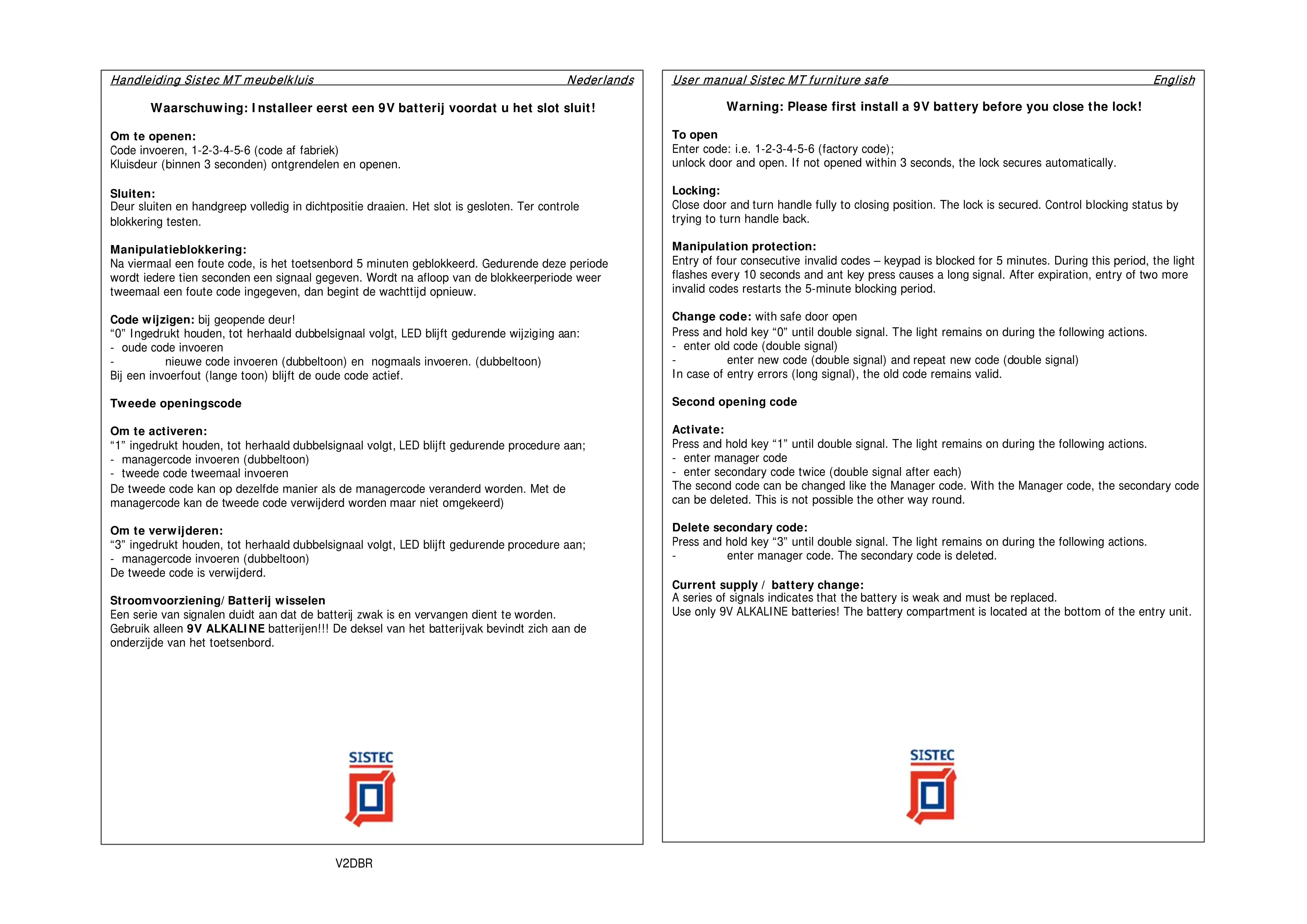 Mode d'emploi Sistec MT coffre-fort à poser