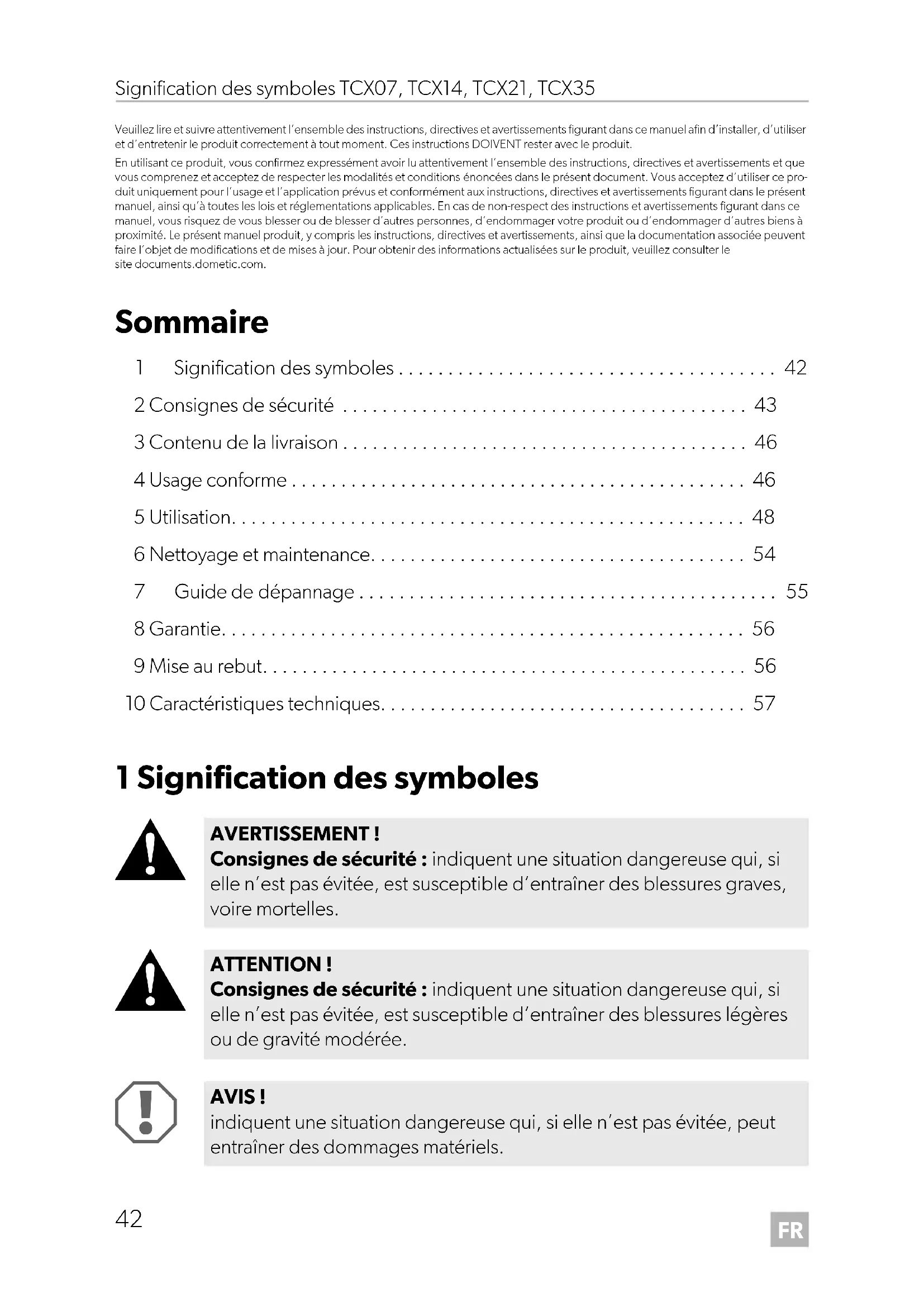 AVERTISSEMENT ! Consignes de sécurité : indiquent une situation dangereuse qui, si elle n’est pas évitée, est susceptible d’entraîner des blessures graves, voire mortelles. ATTENTION ! Consignes de sécurité : indiquent une situation dangereuse qui, si elle n’est pas évitée, est susceptible d’entraîner des blessures légères ou de gravité modérée. AVIS ! indiquent une situation dangereuse qui, si elle n’est pas évitée, peut entraîner des dommages matériels. DometicTCX07-TCX35_OPM_4445103171_EMEA16-ar_202x-xx-xx.book Page 42 Tuesday, November 29, 2022 11:33 AMFR TCX07, TCX14, TCX21, TCX35 Consignes de sécurité