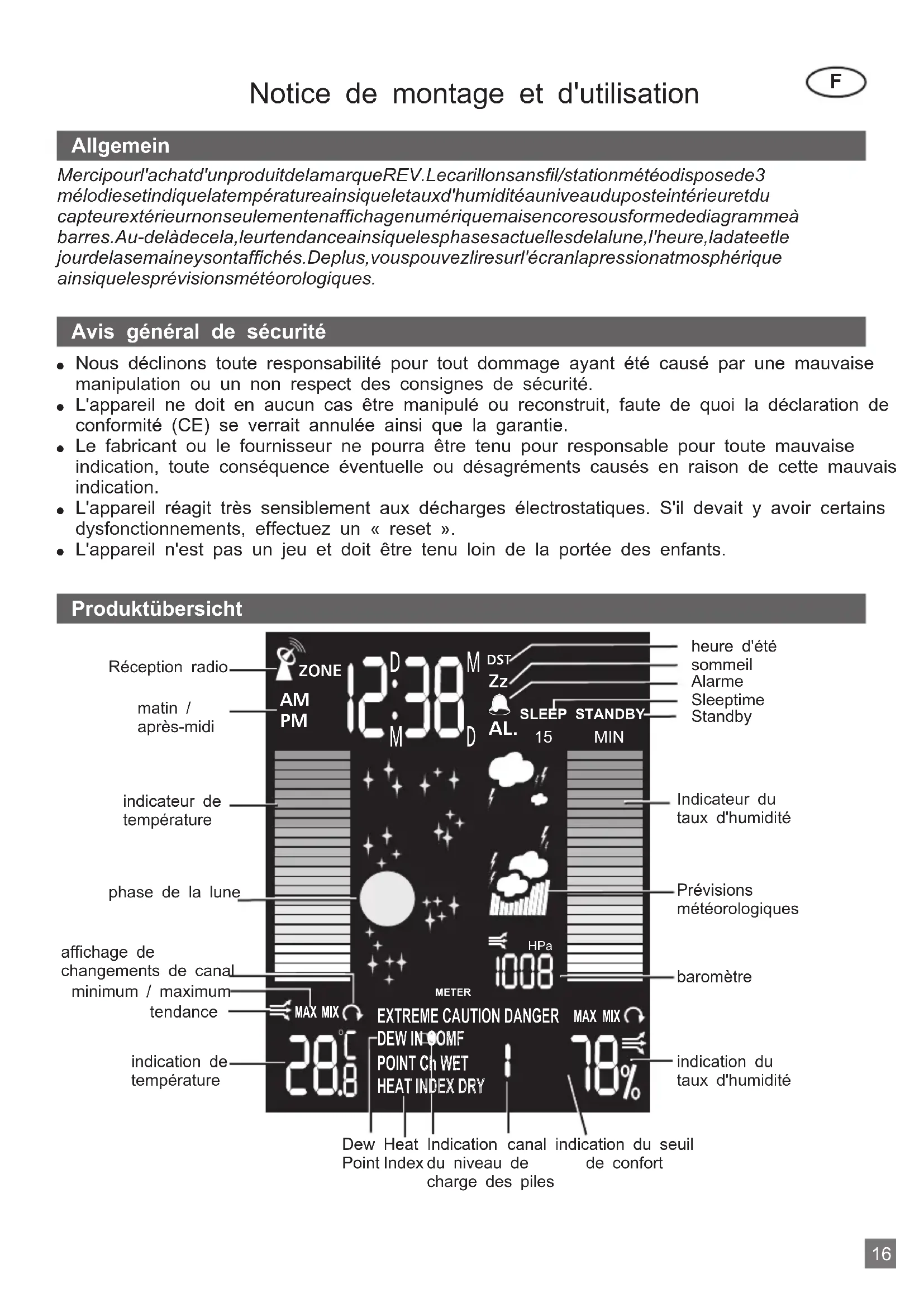 DEW IN COMF POINT Ch WET HEAT INDEX DRY METER HPa MAX Réception radiomatin /après-midiindicateur detempératurephase de la luneaffichage dechangements de canalminimum / maximumtendanceindication detempérature Dew Point Heat IndexIndicationdu niveau decharge des pilescanal indication du seuilde confortindication dutaux d'humiditébaromètrePrévisionsmétéorologiquesIndicateur dutaux d'humiditéStandbySleeptimeAlarmesommeilheure d'été Produktübersicht