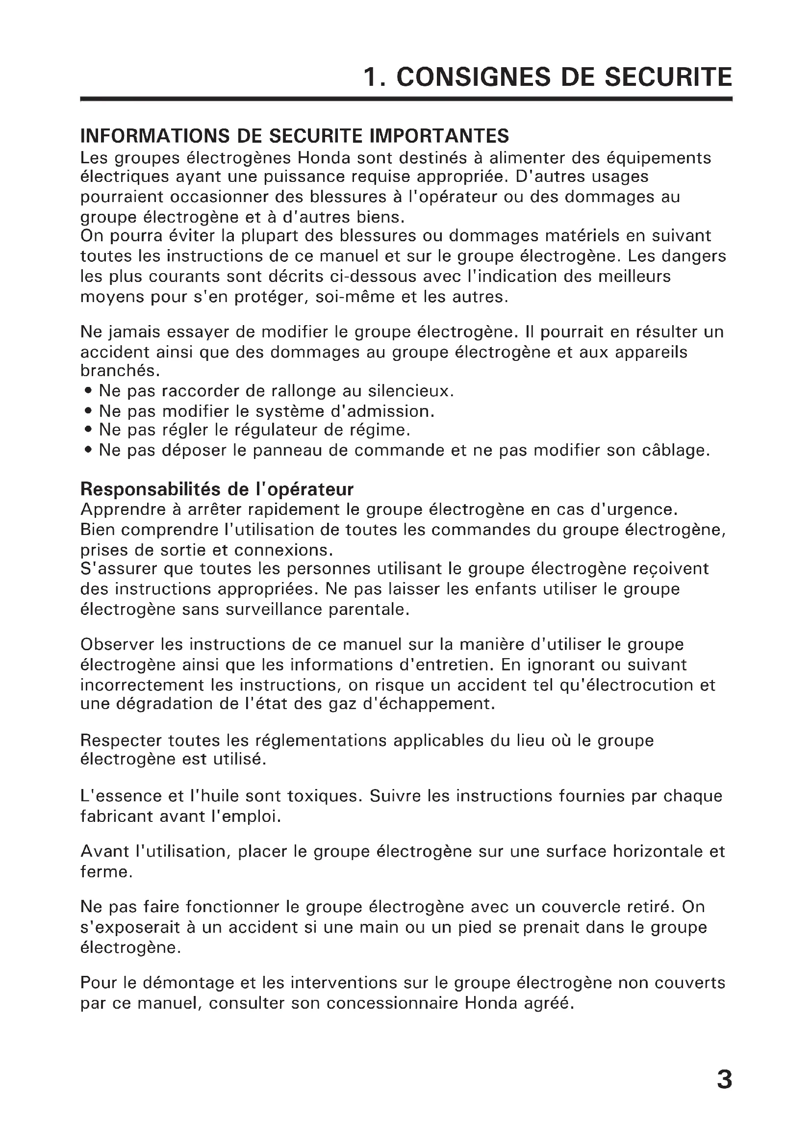 - Les groupes électrogènes Honda ont été conçus pour assurer un fonctionnement sûr et fiable lorsqu'ils sont utilisés conformément aux instructions données. Lire très attentivement le manuel de l'utilisateur avant d'utiliser le groupe électrogène. A défaut, vous vous exposeriez à des blessures et l'équipement pourrait être endommagé.