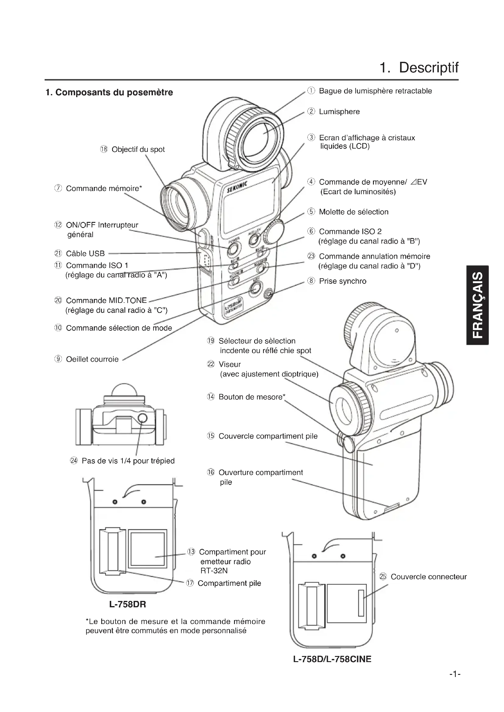 Light Meter Mode d’emploi DIGITALMASTER L-758 Series Veuillez lire attentivement le manuel d'utilisation afin de vous familiariser avec les fonctions de ce produit avant de l'utiliser, et conservez-le pour pouvoir vous y référer ultérieurement. Rangez soigneusement ce manuel d'utilisation.FRANÇAIS