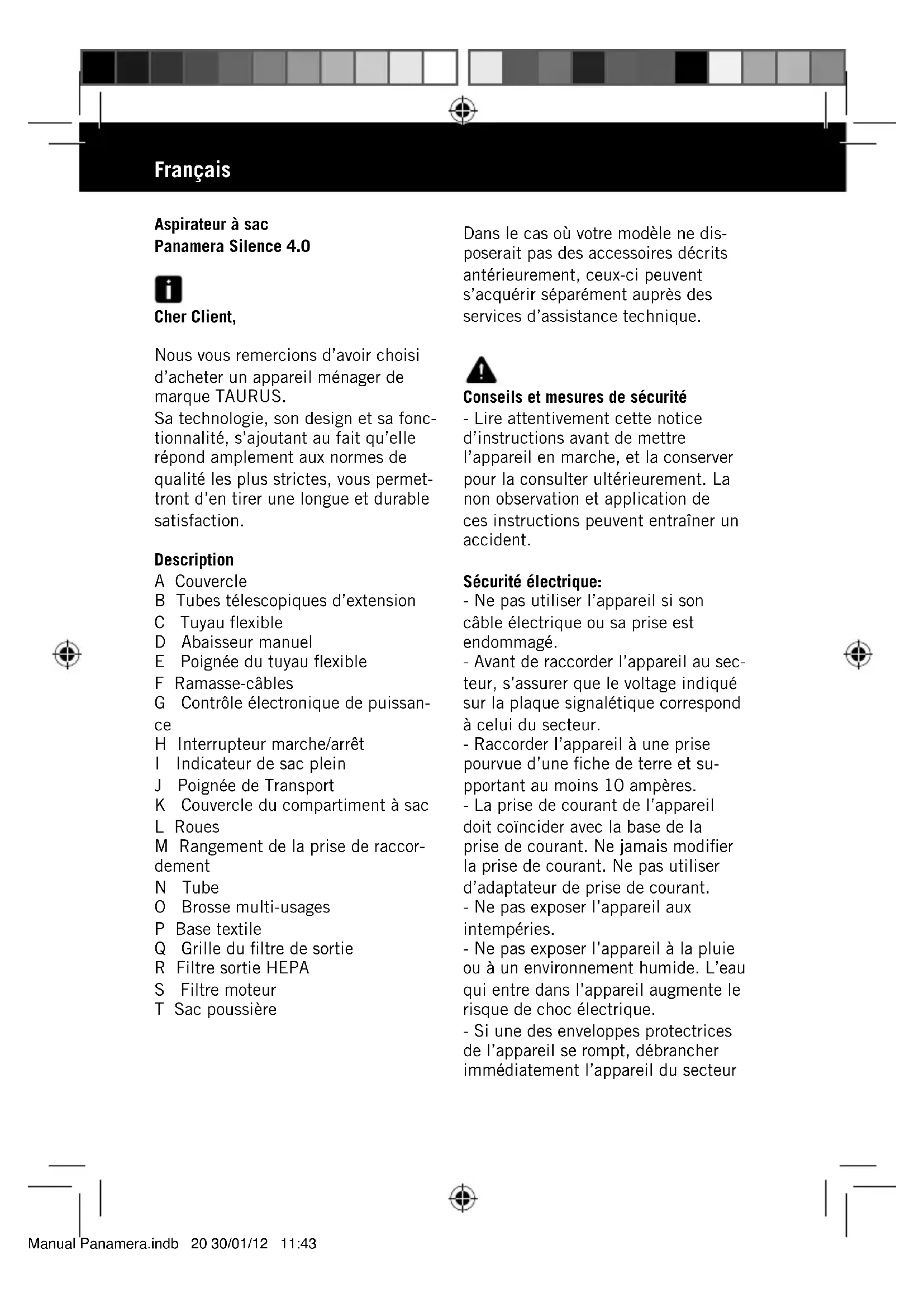 70,8 700Français Aspirateur à sac Panamera Silence 4.0 Cher Client, Nous vous remercions d’avoir choisi d’acheter un appareil ménager de marque TAURUS. Sa technologie, son design et sa fonc- tionnalité, s’ajoutant au fait qu’elle répond amplement aux normes de qualité les plus strictes, vous permet- tront d’en tirer une longue et durable satisfaction. Description A Couvercle B Tubes télescopiques d’extension C Tuyau flexible D Abaisseur manuel E Poignée du tuyau flexible F Ramasse-câbles G Contrôle électronique de puissan-