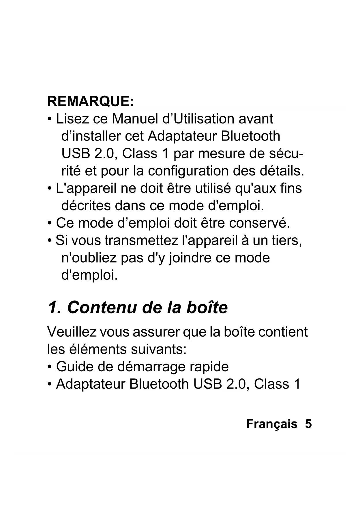 - Lisez ce Manuel d’Utilisation avant d’installer cet Adaptateur Bluetooth USB 2.0, Class 1 par mesure de sécu- rité et pour la configuration des détails.