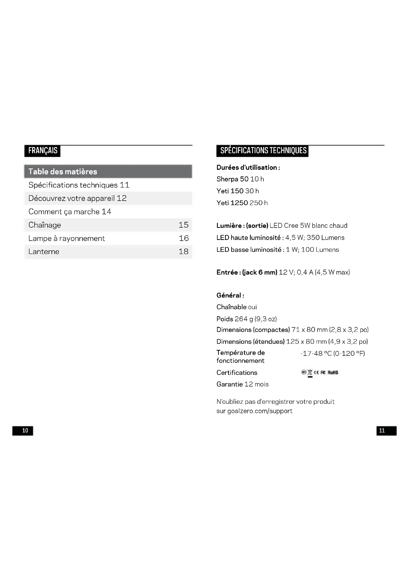 light clockwise.1110 Durées d’utilisation: Sherpa 50 10h Yeti 150 30h Yeti 1250 250h Lumière: (sortie) LED Cree 5W blanc chaud LED haute luminosité: 4,5W; 350Lumens LED basse luminosité: 1W; 100Lumens Entrée: (jack 6mm) 12V; 0,4A (4,5W max) Général: Chaînable oui Poids 264g (9,3oz) Dimensions (compactes) 71x80mm (2,8x3,2po) Dimensions (étendues) 125x80mm (4,9x3,2po) Température de fonctionnement -17-48°C (0-120°F) Certifications Garantie 12mois N’oubliez pas d’enregistrer votre produit sur goalzero.com/support