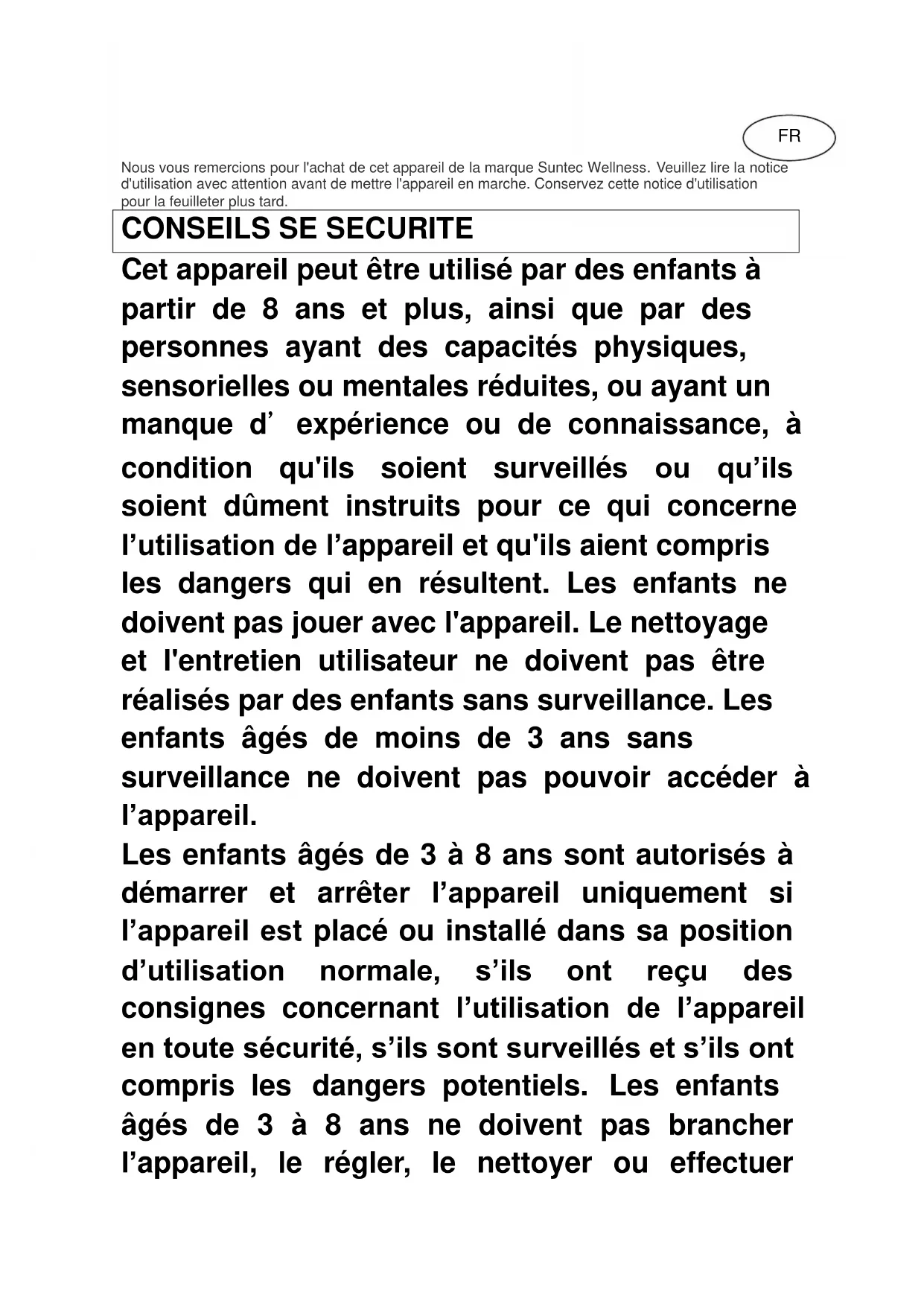 Cet appareil peut être utilisé par des enfants à partir de 8 ans et plus, ainsi que par des personnes ayant des capacités physiques, sensorielles ou mentales réduites, ou ayant un manque d’expérience ou de connaissance, à condition qu'ils soient surveillés ou qu’ils soient dûment instruits pour ce qui concerne l’utilisation de l’appareil et qu'ils aient compris les dangers qui en résultent. Les enfants ne doivent pas jouer avec l'appareil. Le nettoyage et l'entretien utilisateur ne doivent pas être réalisés par des enfants sans surveillance. Les enfants âgés de moins de 3 ans sans surveillance ne doivent pas pouvoir accéder à l’appareil. Les enfants âgés de 3 à 8 ans sont autorisés à démarrer et arrêter l’appareil uniquement si l’appareil est placé ou installé dans sa position d’utilisation normale, s’ils ont reçu des consignes concernant l’utilisation de l’appareil en toute sécurité, s’ils sont surveillés et s’ils ont compris les dangers potentiels. Les enfants âgés de 3 à 8 ans ne doivent pas brancher l’appareil, le régler, le nettoyer ou effectuer FRl’entretien.