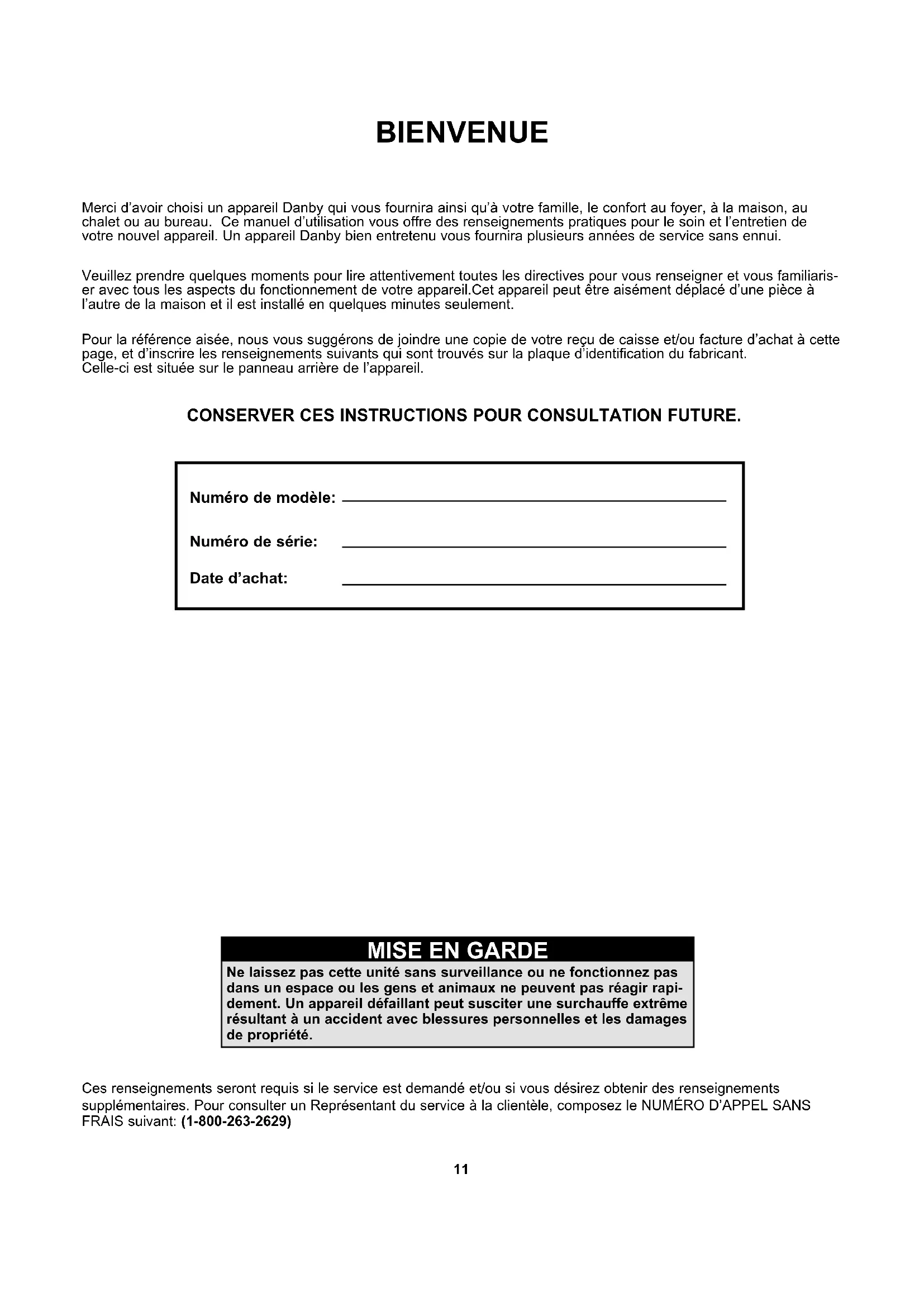 Ne laissez pas cette unité sans surveillance ou ne fonctionnez pas dans un espace ou les gens et animaux ne peuvent pas réagir rapi- dement. Un appareil défaillant peut susciter une surchauffe extrême résultant à un accident avec blessures personnelles et les damages de propriété. 11REMARQUE Les instructions de sécurité présentées dans ce manuel ne peuvent cou- vrir toutes les situations qui pourraient survenir. Chacun doit comprendre qui l’utilisation adéquate de l’appareil lui-même et qui relèvent uniquement du comportement de la personne qui installe l’appareil ou l’utilise, ou qui exécute les opérations d’entretien. Le non-respect des instructions d’in- stallation, d’utilisation ou d’entretien de l’appareil fournies par le fabricant peut susciter une sitution pouvant conduire à des dommages matériels et/ou corporels. L’utilisateur devrait contacter le revendeur ou un agent de service après-vente du fabricant au sujet de tout problème ou situation qui n’est pas parfaitement compris. Pour contacter le centre de service-client; 1-800-26-DANBY (1-800-263-2629)