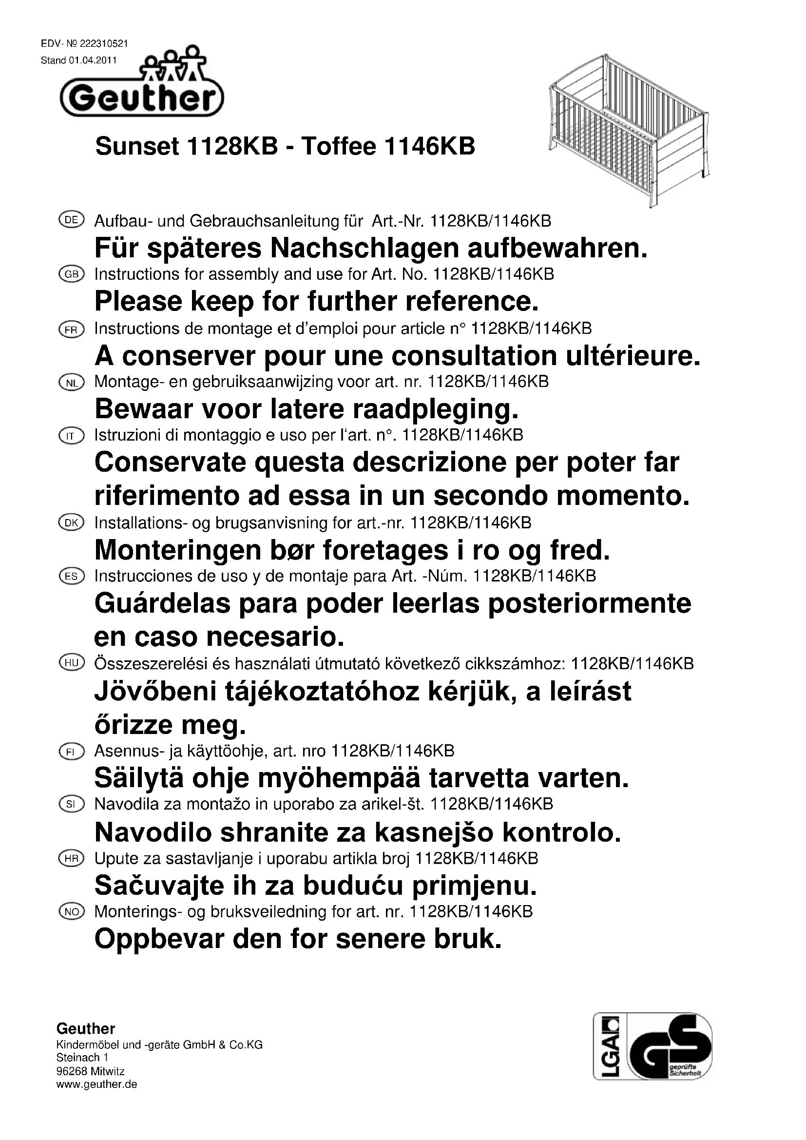 Sunset - Lit bébé Geuther - Notice d'utilisation et mode d'emploi gratuit