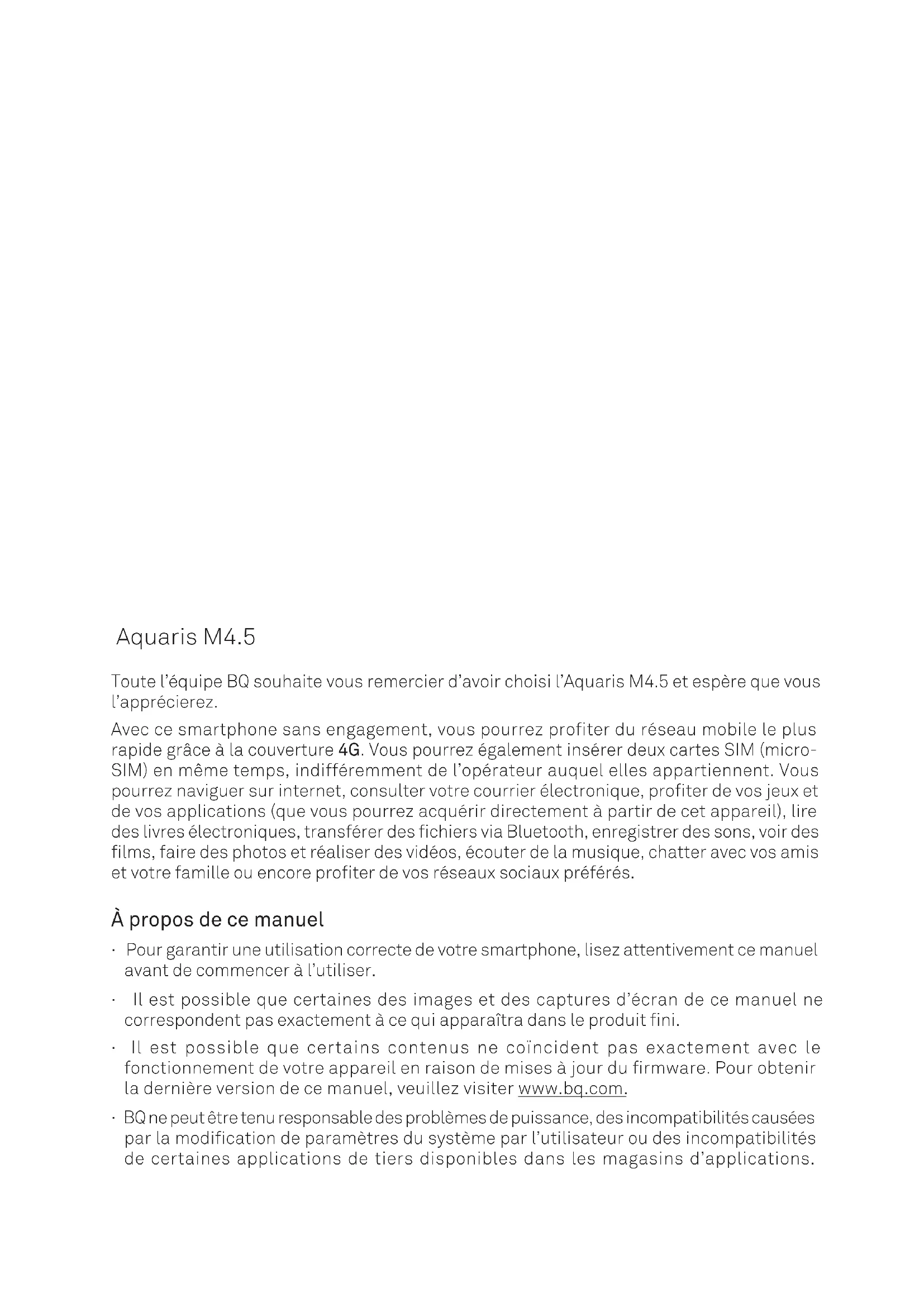 Guide complet d’utilisation Aquaris M4.5Aquaris M4.5 Toute l’équipe BQ souhaite vous remercier d’avoir choisi l’Aquaris M4.5 et espère que vous l’apprécierez. Avec ce smartphone sans engagement, vous pourrez profiter du réseau mobile le plus rapide grâce à la couverture 4G. Vous pourrez également insérer deux cartes SIM (micro- SIM) en même temps, indifféremment de l’opérateur auquel elles appartiennent. Vous pourrez naviguer sur internet, consulter votre courrier électronique, profiter de vos jeux et de vos applications (que vous pourrez acquérir directement à partir de cet appareil), lire des livres électroniques, transférer des fichiers via Bluetooth, enregistrer des sons, voir des films, faire des photos et réaliser des vidéos, écouter de la musique, chatter avec vos amis et votre famille ou encore profiter de vos réseaux sociaux préférés. À propos de ce manuel