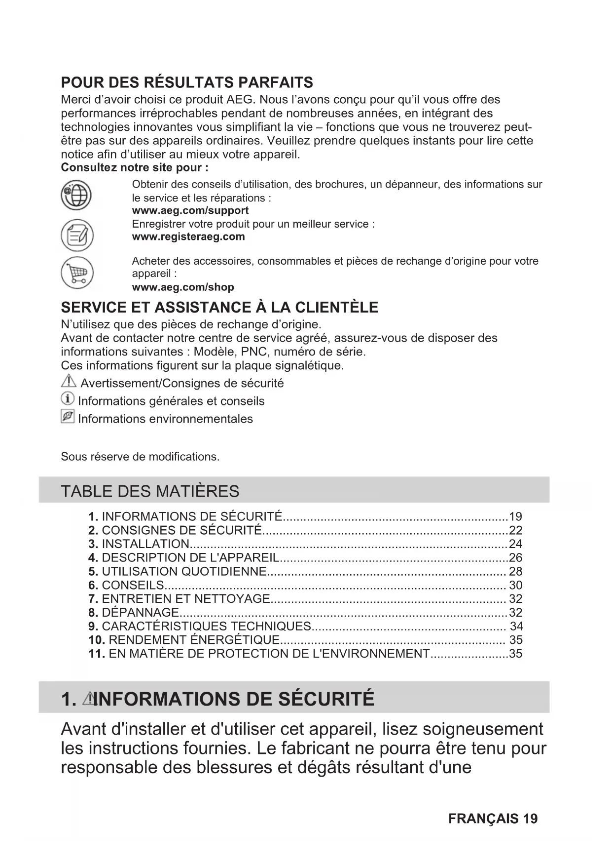 Merci d’avoir choisi ce produit AEG. Nous l’avons conçu pour qu’il vous offre desperformances irréprochables pendant de nombreuses années, en intégrant destechnologies innovantes vous simplifiant la vie – fonctions que vous ne trouverez peut-être pas sur des appareils ordinaires. Veuillez prendre quelques instants pour lire cettenotice afin d’utiliser au mieux votre appareil.Consultez notre site pour :Obtenir des conseils d’utilisation, des brochures, un dépanneur, des informations surle service et les réparations :www.aeg.com/supportEnregistrer votre produit pour un meilleur service :www.registeraeg.comAcheter des accessoires, consommables et pièces de rechange d’origine pour votreappareil :www.aeg.com/shop