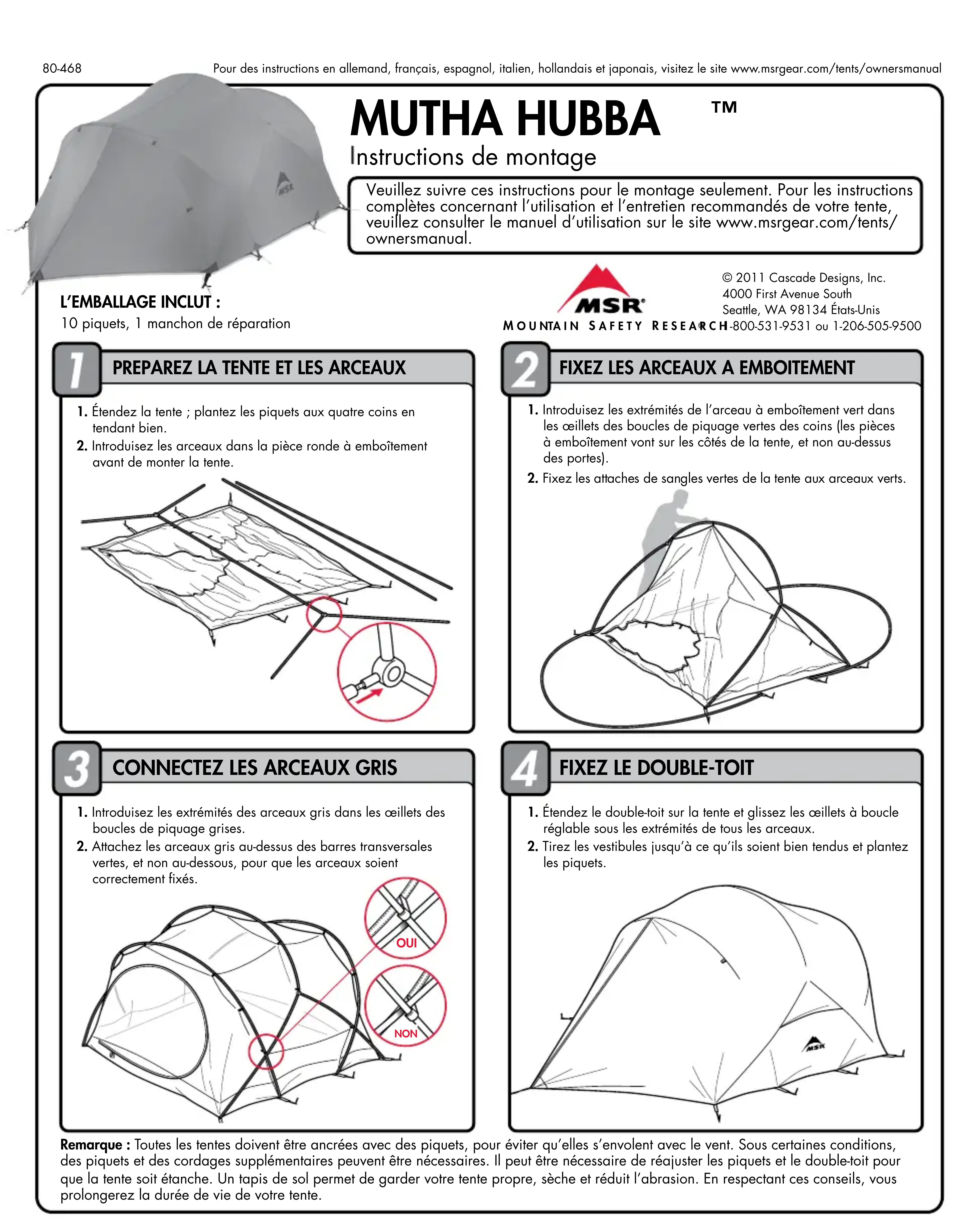 Veuillez suivre ces instructions pour le montage seulement. Pour les instructions complètes concernant l'utilisation et l'entretien recommandés de votre tente, veuillez consulter le manuel d'utilisation sur le site www.msrgear.com/tents/ownersmanual.