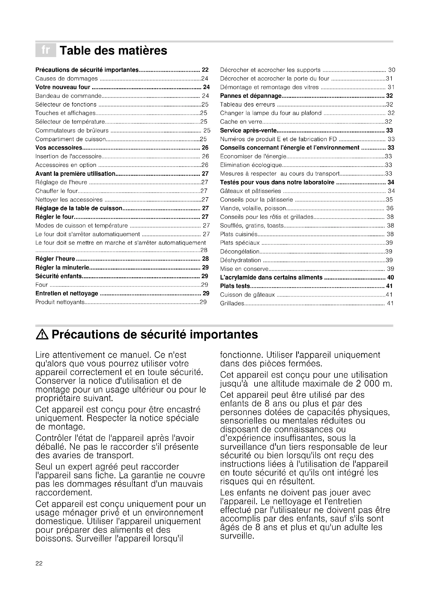 - Grillades : Précautions de sécurité importantes Lire attentivement ce manuel. Ce n'est qu'alors que vous pourrez utiliser votre appareil correctement et en toute sécurité. Conserver la notice d'utilisation et de montage pour un usage ultérieur ou pour le propriétaire suivant. Cet appareil est conçu pour être encastré uniquement. Respecter la notice spéciale de montage. Contrôler l'état de l'appareil après l'avoir déballé. Ne pas le raccorder s'il présente des avaries de transport. Seul un expert agréé peut raccorder l'appareil sans fiche. La garantie ne couvre pas les dommages résultant d'un mauvais raccordement. Cet appareil est conçu uniquement pour un usage ménager privé et un environnement domestique. Utiliser l'appareil uniquement pour préparer des aliments et des boissons. Surveiller l'appareil lorsqu'il fonctionne. Utiliser l'appareil uniquement dans des pièces fermées. Cet appareil est conçu pour une utilisation jusqu'à une altitude maximale de 2 000 m. Cet appareil peut être utilisé par des enfants de 8 ans ou plus et par des personnes dotées de capacités physiques, sensorielles ou mentales réduites ou disposant de connaissances ou d’expérience insuffisantes, sous la surveillance d'un tiers responsable de leur sécurité ou bien lorsqu'ils ont reçu des instructions liées à l'utilisation de l'appareil en toute sécurité et qu'ils ont intégré les risques qui en résultent. Les enfants ne doivent pas jouer avec l'appareil. Le nettoyage et l'entretien effectué par l'utilisateur ne doivent pas être accomplis par des enfants, sauf s'ils sont âgés de 8 ans et plus et qu'un adulte les surveille.23 Les enfants de moins de 8 ans doivent être tenus à distance de l'appareil et du cordon d'alimentation. Toujours insérer les accessoires à l'endroit dans le four. Voir la description des accessoires dans la notice d'utilisation. Risque d'incendie ! p. 41