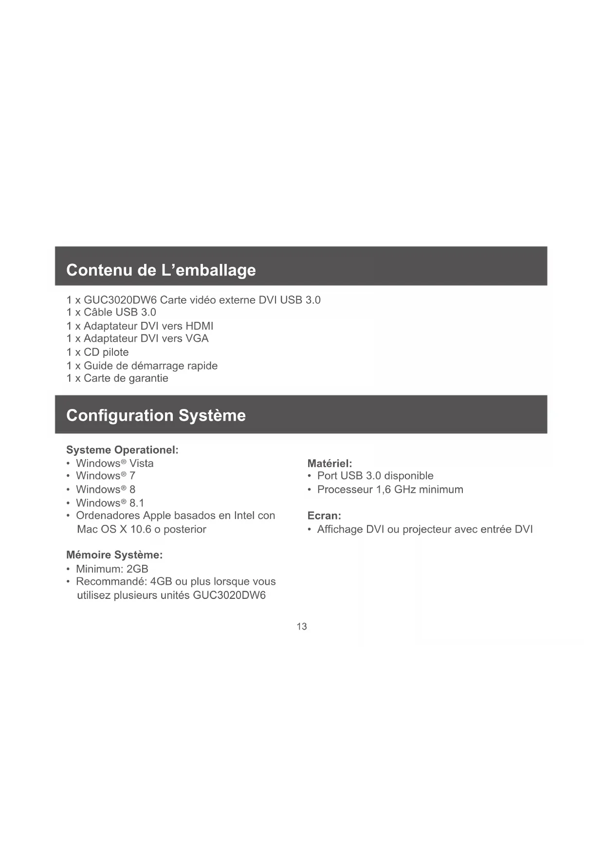 - Recommandé: 4GB ou plus lorsque vous utilisez plusieurs unités GUC3020DW6 Matériel: