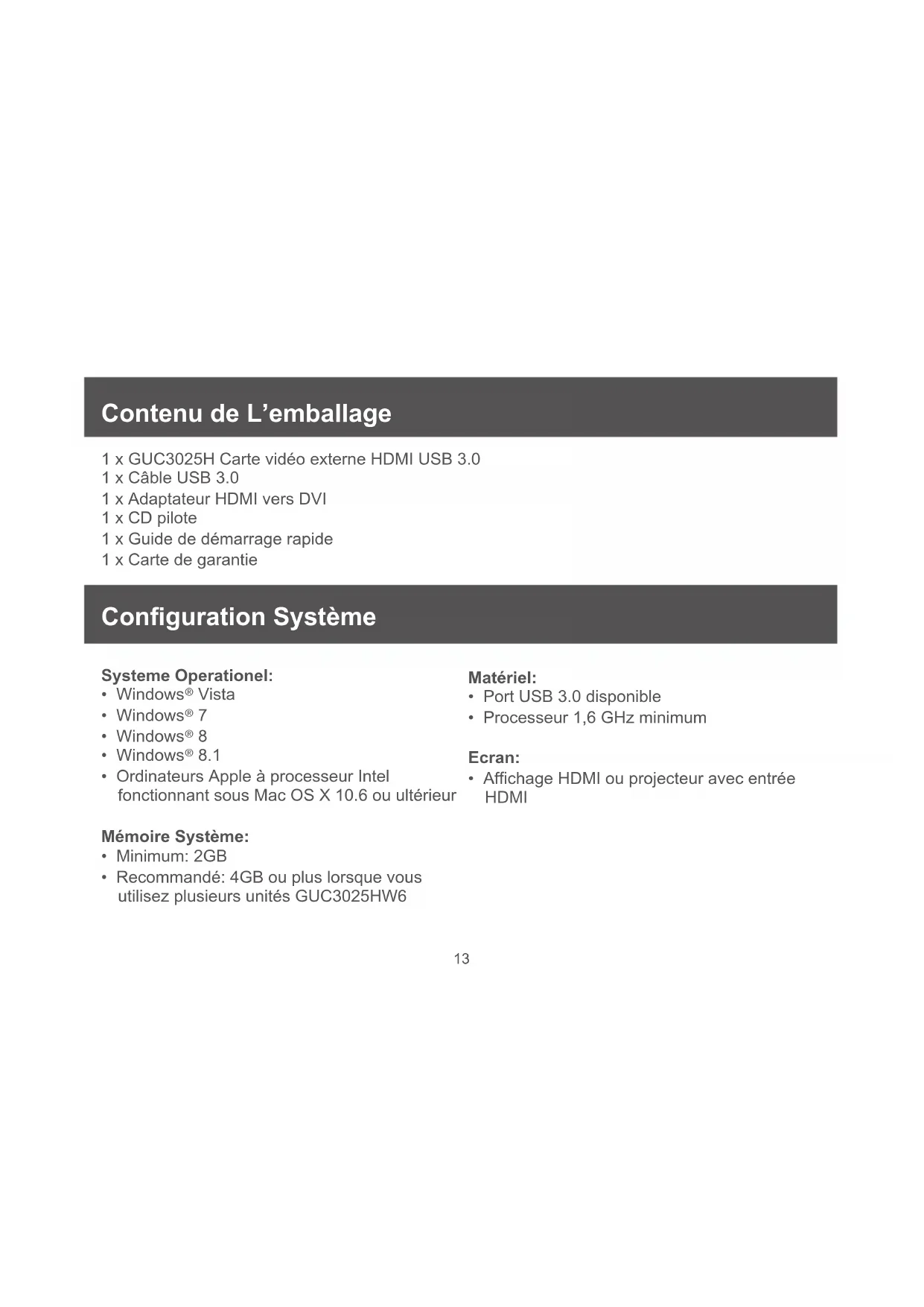 - Recommandé: 4GB ou plus lorsque vous utilisez plusieurs unités GUC3025HW6 Matériel: