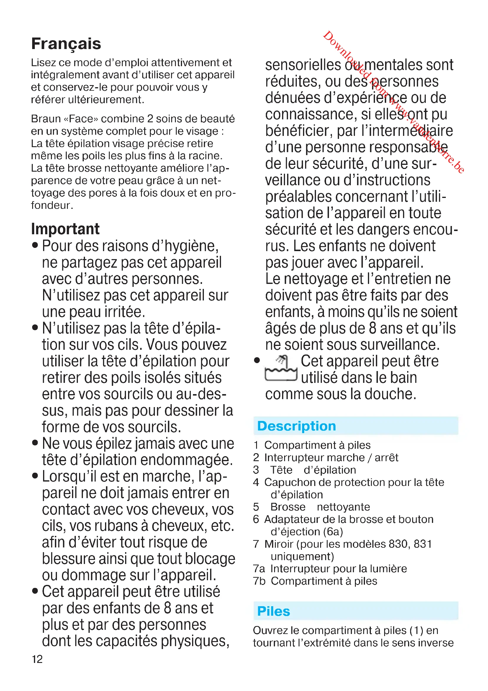 Cet appareil peut être utilisé dans le bain comme sous la douche. Description 1 Compartiment à piles 2 Interrupteur marche / arrêt 3 Tête d’épilation 4 Capuchon de protection pour la tête d’épilation 5 Brosse nettoyante 6 Adaptateur de la brosse et bouton d’éjection (6a) 7 Miroir (pour les modèles 830, 831 uniquement) 7a Interrupteur pour la lumière 7b Compartiment à piles Piles Ouvrez le compartiment à piles (1) en tournant l’extrémité dans le sens inverse 96892473_SE810_S4-110.indd 1296892473_SE810_S4-110.indd 12 27.02.14 15:3327.02.14 15:33 CSS APPROVED Effective Date 5Mar2014 GMT - Printed 02Oct2014 Page 12 of 110 Downloaded from www.vandenborre.be13 des aiguilles d’une montre à l’aide d’une pile. Insérez une pile alcaline AA (1,5 V) en respectant la polarité. Remettez en place l’extrémité et tournez dans le sens des aiguilles d’une montre afin de la blo- quer. Remplacez la pile lorsque néces- saire. Assurez-vous que vos mains et l’appareil soient secs lorsque vous rem- placez la batterie. Miroir : Ouvrez le compartiment à piles (7b) avec un tournevis comme indiqué sur le schéma. Insérez 3 piles boutons (type LR1130) avec le pole « + » sur le dessus. Remettez en place le cache-pile. Les piles peuvent fuir si elles sont vides ou non utilisées pendant longtemps. Afin de vous protéger ainsi que votre appa- reil, prenez soin de retirer les piles dans les meilleurs délais et d’éviter tout contact avec la peau lorsque vous manipulez des piles endommagées. Epilation du visage