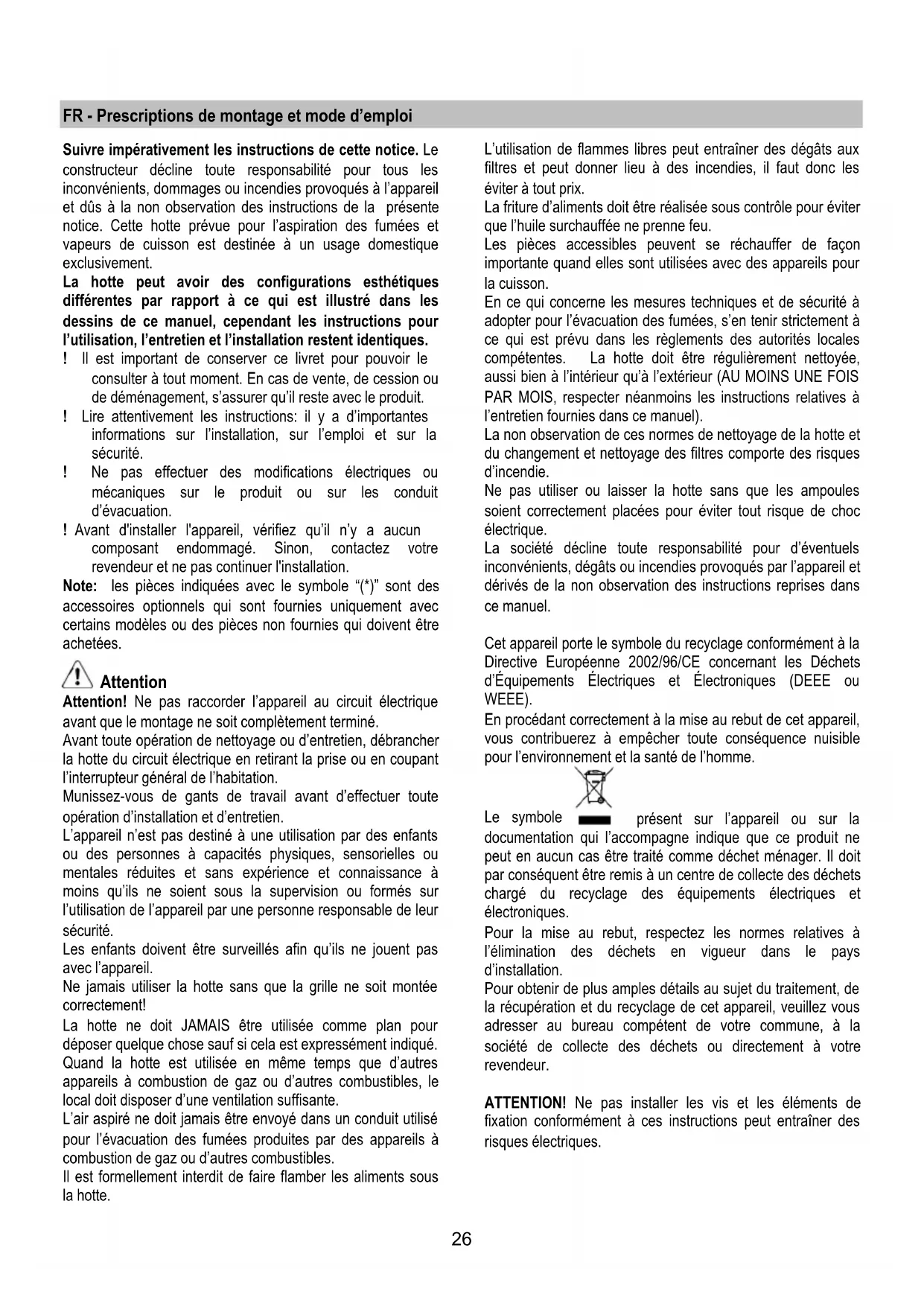 - NICHT waschbar. Der waschbare Aktivkohlefilter Der Aktivkohlefilter wird alle zwei Monate in warmem Wasser und geeigneten Waschmitteln oder in der Spülmaschine bei 65°C gewaschen (in diesem Fall den ollständigen Spülzyklus – ohne zusätzliches Geschirr im Inneren der Geschirrspülmaschine - einschalten). Das überschüssige Wasser entfernen, ohne dabei den Filter zu beschädigen; danach das Vlies aus dem Plastikrahmen entfernen und dieses bei 100° für 10 Minuten in den Ofen legen, um es vollständig zu trocknen. Das Vlies muss alle 3 Jahre ausgewechselt werden und weiterhin jedes Mal dann, wenn es beschädigt ist. Der NICHT waschbare Aktivkohlefilter Je nach der Benetzungsdauer des Herdes und der Häufigkeit der Reinigung des Fettfilters tritt nach einer mehr oder weniger langen Benutzungsdauer die Sättigung des Aktivkohlefilters auf. Auf jeden Fall muß der Filtereinsatz mindestens alle 4 Monate ausgewechselt werden. Er kann NICHT gereinigt oder erneut aktiviert werden. Montage Den Aktivkohlefilter zuerst von hinten auf der metallischen Feder der Saugkappe anhaengen, dann von vorne mit den zwei Knoepfen. Demontage Den Aktivkohlefilter entnehmen, in dem man die Knoepfe die an der Saugkappe fixiert sind auf 90° dreht. Ersetzen der Lampen Die Haube ist mit einem auf der Leuchtdiodentechnologie basierten Beleuchtungssystem ausgestattet. Die LEDs ermöglichen eine optimale Beleuchtung der Kochfläche. Sie haben eine Leistungsdauer, die das Zehnfache deren der traditionellen Lichter ist und bieten eine Energieersparnis bis zu 90%. Um die Leds mit neuen zu ersetzen, setzen Sie sich bitte mit dem Kundendienst in Verbindung.26 FR - Prescriptions de montage et mode d’emploi Suivre impérativement les instructions de cette notice. Le constructeur décline toute responsabilité pour tous les inconvénients, dommages ou incendies provoqués à l’appareil et dûs à la non observation des instructions de la présente notice. Cette hotte prévue pour l’aspiration des fumées et vapeurs de cuisson est destinée à un usage domestique exclusivement. La hotte peut avoir des configurations esthétiques différentes par rapport à ce qui est illustré dans les dessins de ce manuel, cependant les instructions pour l’utilisation, l’entretien et l’installation restent identiques. ! Il est important de conserver ce livret pour pouvoir le consulter à tout moment. En cas de vente, de cession ou de déménagement, s’assurer qu’il reste avec le produit. ! Lire attentivement les instructions: il y a d’importantes informations sur l’installation, sur l’emploi et sur la sécurité. ! Ne pas effectuer des modifications électriques ou mécaniques sur le produit ou sur les conduit d’évacuation. ! Avant d'installer l'appareil, vérifiez qu’il n’y a aucun composant endommagé. Sinon, contactez votre revendeur et ne pas continuer l'installation. Note: les pièces indiquées avec le symbole “(*)” sont des accessoires optionnels qui sont fournies uniquement avec certains modèles ou des pièces non fournies qui doivent être achetées. Attention Attention! Ne pas raccorder l’appareil au circuit électrique avant que le montage ne soit complètement terminé. Avant toute opération de nettoyage ou d’entretien, débrancher la hotte du circuit électrique en retirant la prise ou en coupant l’interrupteur général de l’habitation. Munissez-vous de gants de travail avant d’effectuer toute opération d’installation et d’entretien. L’appareil n’est pas destiné à une utilisation par des enfants ou des personnes à capacités physiques, sensorielles ou mentales réduites et sans expérience et connaissance à moins qu’ils ne soient sous la supervision ou formés sur l’utilisation de l’appareil par une personne responsable de leur sécurité. Les enfants doivent être surveillés afin qu’ils ne jouent pas avec l’appareil. Ne jamais utiliser la hotte sans que la grille ne soit montée correctement! La hotte ne doit JAMAIS être utilisée comme plan pour déposer quelque chose sauf si cela est expressément indiqué. Quand la hotte est utilisée en même temps que d’autres appareils à combustion de gaz ou d’autres combustibles, le local doit disposer d’une ventilation suffisante. L’air aspiré ne doit jamais être envoyé dans un conduit utilisé pour l’évacuation des fumées produites par des appareils à combustion de gaz ou d’autres combustibles. Il est formellement interdit de faire flamber les aliments sous la hotte. L’utilisation de flammes libres peut entraîner des dégâts aux filtres et peut donner lieu à des incendies, il faut donc les éviter à tout prix. La friture d’aliments doit être réalisée sous contrôle pour éviter que l’huile surchauffée ne prenne feu. Les pièces accessibles peuvent se réchauffer de façon importante quand elles sont utilisées avec des appareils pour la cuisson. En ce qui concerne les mesures techniques et de sécurité à adopter pour l’évacuation des fumées, s’en tenir strictement à ce qui est prévu dans les règlements des autorités locales compétentes. La hotte doit être régulièrement nettoyée, aussi bien à l’intérieur qu’à l’extérieur (AU MOINS UNE FOIS PAR MOIS, respecter néanmoins les instructions relatives à l’entretien fournies dans ce manuel). La non observation de ces normes de nettoyage de la hotte et du changement et nettoyage des filtres comporte des risques d’incendie. Ne pas utiliser ou laisser la hotte sans que les ampoules soient correctement placées pour éviter tout risque de choc électrique. La société décline toute responsabilité pour d’éventuels inconvénients, dégâts ou incendies provoqués par l’appareil et dérivés de la non observation des instructions reprises dans ce manuel. Cet appareil porte le symbole du recyclage conformément à la Directive Européenne 2002/96/CE concernant les Déchets d’Équipements Électriques 