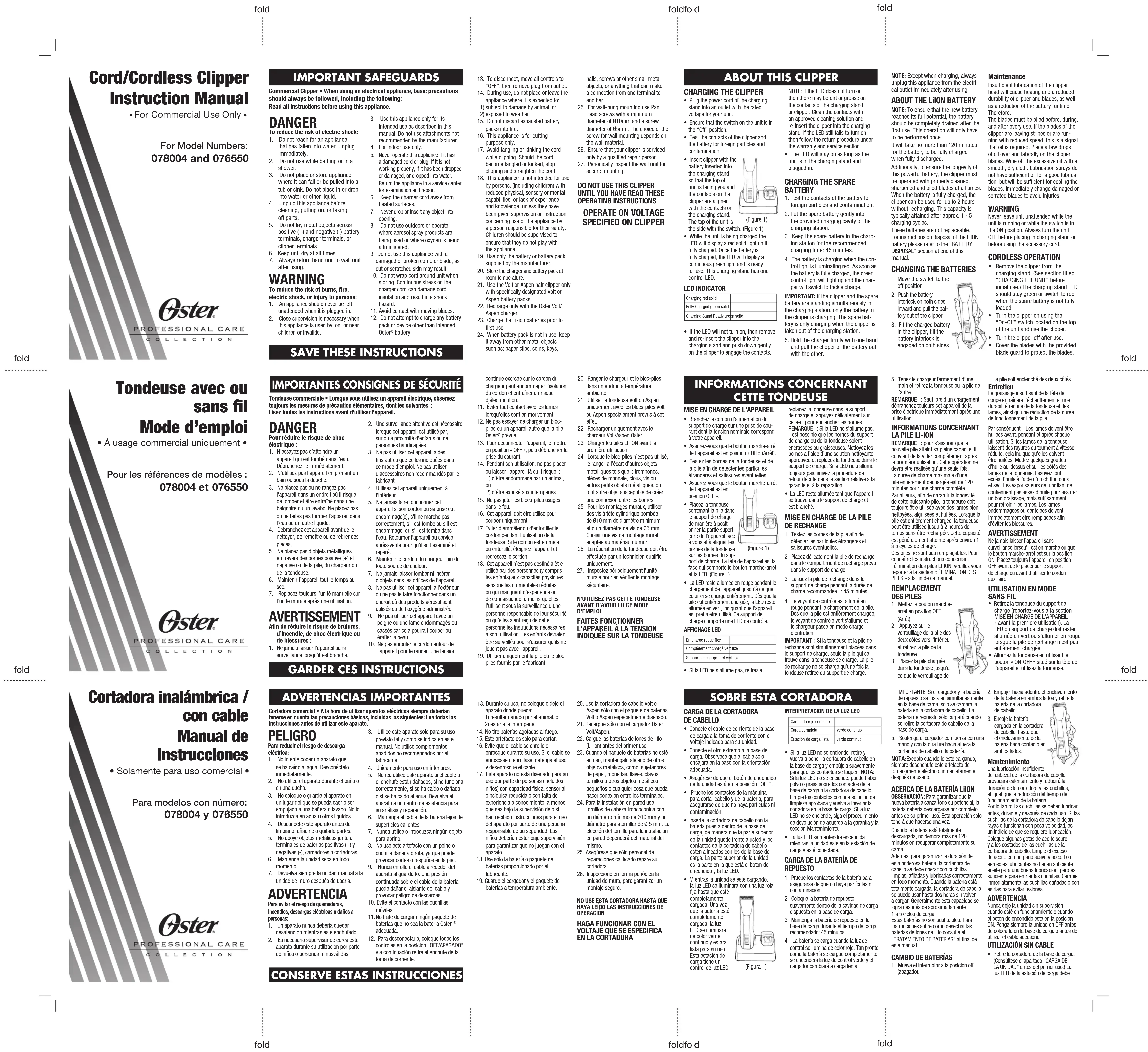 continue exercée sur le cordon du chargeur peut endommager l’isolation du cordon et entraîner un risque d’électrocution.11. Éviter tout contact avec les lames lorsqu’elles sont en mouvement. Ne pas essayer de charger un bloc-piles ou un appareil autre que la pile Oster prévue.13. Pour déconnecter l’appareil, le mettre en position « OFF », puis débrancher la prise du courant.14. Pendant son utilisation, ne pas placer ou laisser l’appareil là où il risque : 1) d’être endommagé par un animal, 2) d’être exposé aux intempéries.15. Ne pas jeter les blocs-piles usagés dans le feu.16. Cet appareil doit être utilisé pour couper uniquement.17. Éviter d’emmêler ou d’entortiller le cordon pendant l’utilisation de la tondeuse. Si le cordon est emmêlé ou entortillé, éteignez l’appareil et redressez le cordon.18. Cet appareil n’est pas destiné à être utilisé par des personnes (y compris les enfants) aux capacités physiques, sensorielles ou mentales réduites, ou qui manquent d’expérience ou de connaissance, à moins qu’elles l’utilisent sous la surveillance d’une personne responsable de leur sécurité ou qu’elles aient reçu de cette personne les instructions nécessaires à son utilisation. Les enfants devraient être surveillés pour s’assurer qu’ils ne jouent pas avec l’appareil.19. Utiliser uniquement la pile ou le bloc-piles fournis par le fabricant.20. Ranger le chargeur et le bloc-piles dans un endroit à température ambiante.21. Utiliser la tondeuse Volt ou Aspen uniquement avec les blocs-piles Volt ou Aspen spécialement prévus à cet effet.22. Recharger uniquement avec le chargeur Volt/Aspen Oster.23. Charger les piles LI-ION avant la première utilisation.24. Lorsque le bloc-piles n’est pas utilisé, le ranger à l’écart d’autres objets métalliques tels que : trombones, pièces de monnaie, clous, vis ou autres petits objets métalliques, ou tout autre objet susceptible de créer une connexion entre les bornes.25. Pour les montages muraux, utiliser des vis à tête cylindrique bombée de Ø10 mm de diamètre minimum et d’un diamètre de vis de Ø5 mm. Choisir une vis de montage mural adaptée au matériau du mur.26. La réparation de la tondeuse doit être effectuée par un technicien qualifié uniquement.27. Inspectez périodiquement l’unité murale pour en vérifier le montage sécuritaire.N’UTILISEZ PAS CETTE TONDEUSE AVANT D’AVOIR LU CE MODE D’EMPLOI FAITES FONCTIONNER
