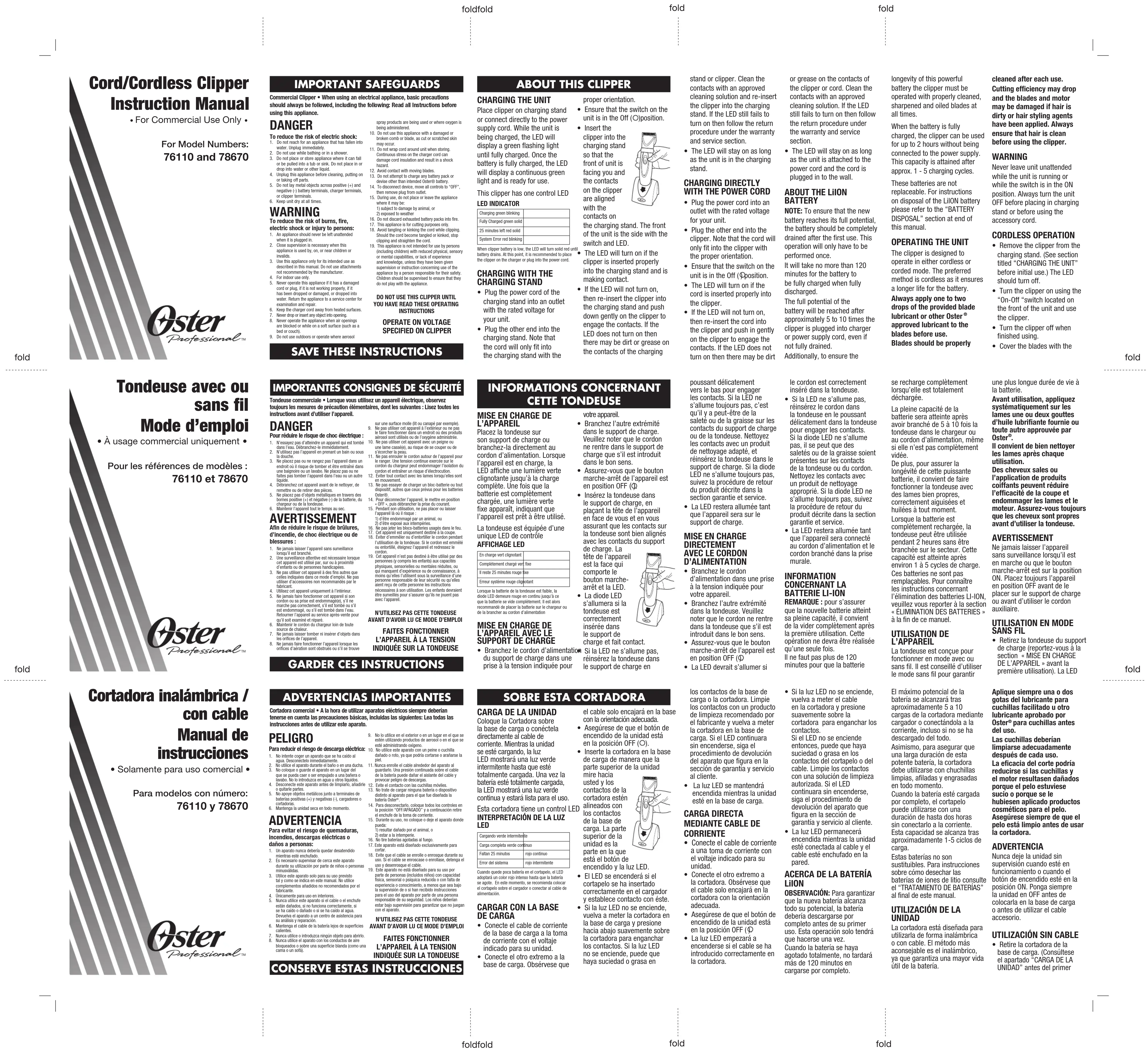 - Remove the clipper from the charging stand. (See section titled “CHARGING THE UNIT” before initial use.) The LED should turn off.• Turn the clipper on using the “On-Off “switch located on the front of the unit and use the clipper.• Turn the clipper off when finished using.• Cover the blades with the se recharge complètement lorsqu’elle est totalement déchargée.La pleine capacité de la batterie sera atteinte après avoir branché de 5 à 10 fois la tondeuse dans le chargeur ou au cordon d’alimentation, même si elle n’est pas complètement vidée. De plus, pour assurer la longévité de cette puissante batterie, il convient de faire fonctionner la tondeuse avec des lames bien propres, correctement aiguisées et huilées à tout moment. Lorsque la batterie est complètement rechargée, la tondeuse peut être utilisée pendant 2 heures sans être branchée sur le secteur. Cette capacité est atteinte après environ 1 à 5 cycles de charge.Ces batteries ne sont pas remplaçables. Pour connaître les instructions concernant l’élimination des batteries LI-ION, veuillez vous reporter à la section « ÉLIMINATION DES BATTERIES » à la fin de ce manuel. UTILISATION DE L’APPAREIL La tondeuse est conçue pour fonctionner en mode avec ou sans fil. Il est conseillé d’utiliser le mode sans fil pour garantir une plus longue durée de vie à la batterie.Avant utilisation, appliquez systématiquement sur les lames une ou deux gouttes d’huile lubrifiante fournie ou toute autre approuvée par Oster