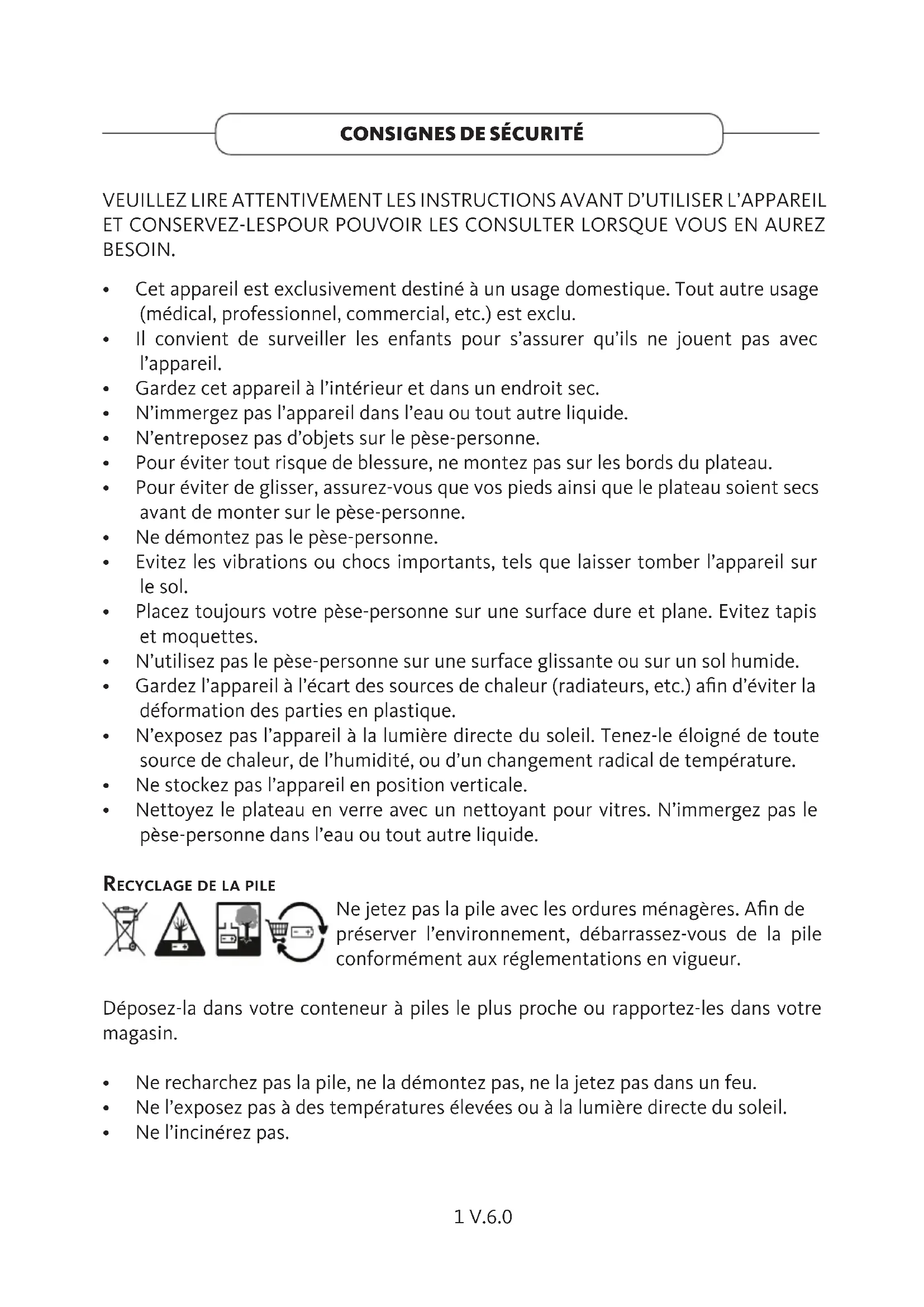 - Nettoyez le plateau en verre avec un nettoyant pour vitres. N’immergez pas le pèse-personne dans l’eau ou tout autre liquide. Recyclage de la pile Nejetezpaslapileaveclesorduresménagères.Ande préserver l’environnement, débarrassez-vous de la pile conformément aux réglementations en vigueur. Déposez-la dans votre conteneur à piles le plus proche ou rapportez-les dans votre magasin.