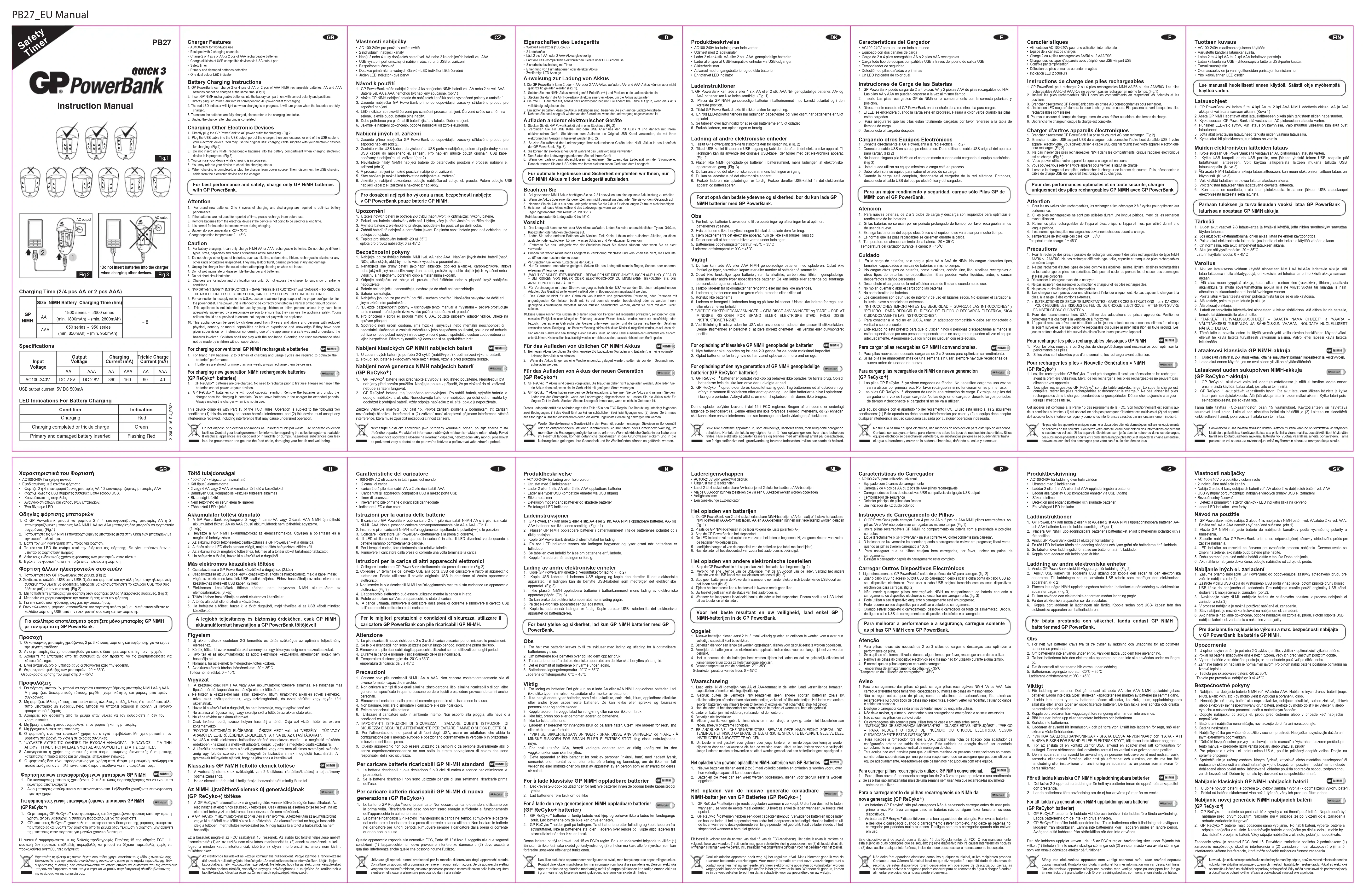 ils soient surveillés par une personne responsable qui puisse assurer l'utilisation en toute sécurité. Les jeunes enfants devraient être surveillés afin qu'ils ne jouent pas avec l'appareil.• Alimentation AC 100-240V pour une utilisation internationale• Equipé de 2 canaux de charges• Charge 2 ou 4 piles rechargeables AA/R6 ou 2 AAA/R03• Charge tous les types d’appareils avec périphérique USB via port USB• Contrôle par temporisation• Détection de piles primaires ou endommagées• Indication LED 2 couleurs Caractéristiques Ne pas jeter les appareils électriques comme la plupart des déchets domestiques, utilisez les équipements de collectes de tris sélectifs. Contactez votre autorité locale pour obtenir des informations concernant le système de collecte. Si les appareils électriques sont jetés dans la nature ou dans les décharges, des substances polluantes pourraient couler dans la nappe phréatique et impacter la chaîne alimentaire, pouvant causer ainsi des dommages pour votre santé ou le bien être de tous.Pour des performances optimales et en toute sécurité, charger uniquement des piles rechargeables GP NiMH avec GP PowerBankCet appareil est conforme à la Partie 15 des règlements de la FCC. Son fonctionnement est soumis aux deux conditions suivantes: (1) cet appareil ne dois pas provoquer d'interférences nuisibles et (2) cet appareil doit accepter toute interférence reçue, y compris les interférences causées par un fonctionnement indésiré. 1. GP PowerBank puede cargar de 2 a 4 piezas AA y 2 piezas AAA de pilas recargables de NiMh. Las pilas AA y AAA no pueden cargarse a la vez al mismo tiempo. 2. Inserte Las pilas recargables GP de NiMh en el compartimento con la correcta polarizad y posición.3. Directamente conecte el GP PowerBank en el enchufe de la red eléctrica para cargar.4. El LED se encenderá cuando la carga esté en progreso. Pasará a color verde cuando las pilas estén cargadas.5. Para asegurarse que las pilas están totalmente cargadas por favor refierase a la tabla de tiempos de carga.6. Desconecte el cargador después. Instruciones de Carga de las Baterías 1. Conecte directamente el GP PowerBank a la red eléctrica. (Fig 2)2. Conecte el cable USB en su equipo electronico. Debe utilizar el cable USB original del aparato para cargar. (Fig 2) 3. No inserte ninguna pila NiMh en el compartimento cuando está cargando el equipo electrónico. (Fig 3) 4. Usted puede utilizar su equipo mientras la carga está en proceso.5. Debe referirse a su equipo para saber el estado de su carga.6. Cuando la carga esté completa, desconecte el cargador de la red eléctrica. Entonces, desconecte el cable USB del equipo electrónico y del cargador. Cargando otros Equipos Electrónicos Atención 1. Para nuevas baterías, de 2 a 3 ciclos de carga y descarga son requeridos para optimizar el rendimiento de las baterías.2. Si las baterías no se usan por un periodo prolongado de tiempo, por favor recarguelas antes de usar de nuevo.3. Extraiga las baterías del equipo electrónico si el equipo no se va a usar por mucho tiempo.4. Es normal que las pilas recargables se calienten durante la carga.5. Temperatura de almacenamiento de la batería: -20 ~ 35°C Temperatura del cargador durante la carga: 0 ~ 45°C Cuidado 1. En la carga de baterías, solo cargue pilas AA o AAA de NiMh. No cargue diferentes tipos, tamaños, capacidades o marcas de baterías al mismo tiempo.2. No cargue otros tipos de baterías, como alcalinas, carbón zinc, litio, alcalinas recargables o otros tipos de baterías no especificadas. Ellas pueden verter líquidos, arder, o causar desperfectos o daños personales.3. Desenchufe el cargador de la red eléctrica antes de limpiar o cuando no se use.4. No mojar, quemar o abrir el cargador o las baterías.5. No cortocircuitar las baterías6. Los cargadores son deun uso de interior y de uso en lugares secos. No exponer el cargador a la lluvia, nieve o condiciones extremas.7. “INTRUCCIONES IMPORTANTES DE SEGURIDAD – GUARDAR LAS INTRUCCIONES” y “PELIGRO - PARA REDUCIR EL RIESGO DE FUEGO O DESCARGA ELECTRICA, SIGA CUIDADOSAMENTE LAS INSTRUCCIONES”.8. Para conectar a la red no en U.S.A, usar un adaptador compatible y debe ser conectado o vertical o sobre el suelo.