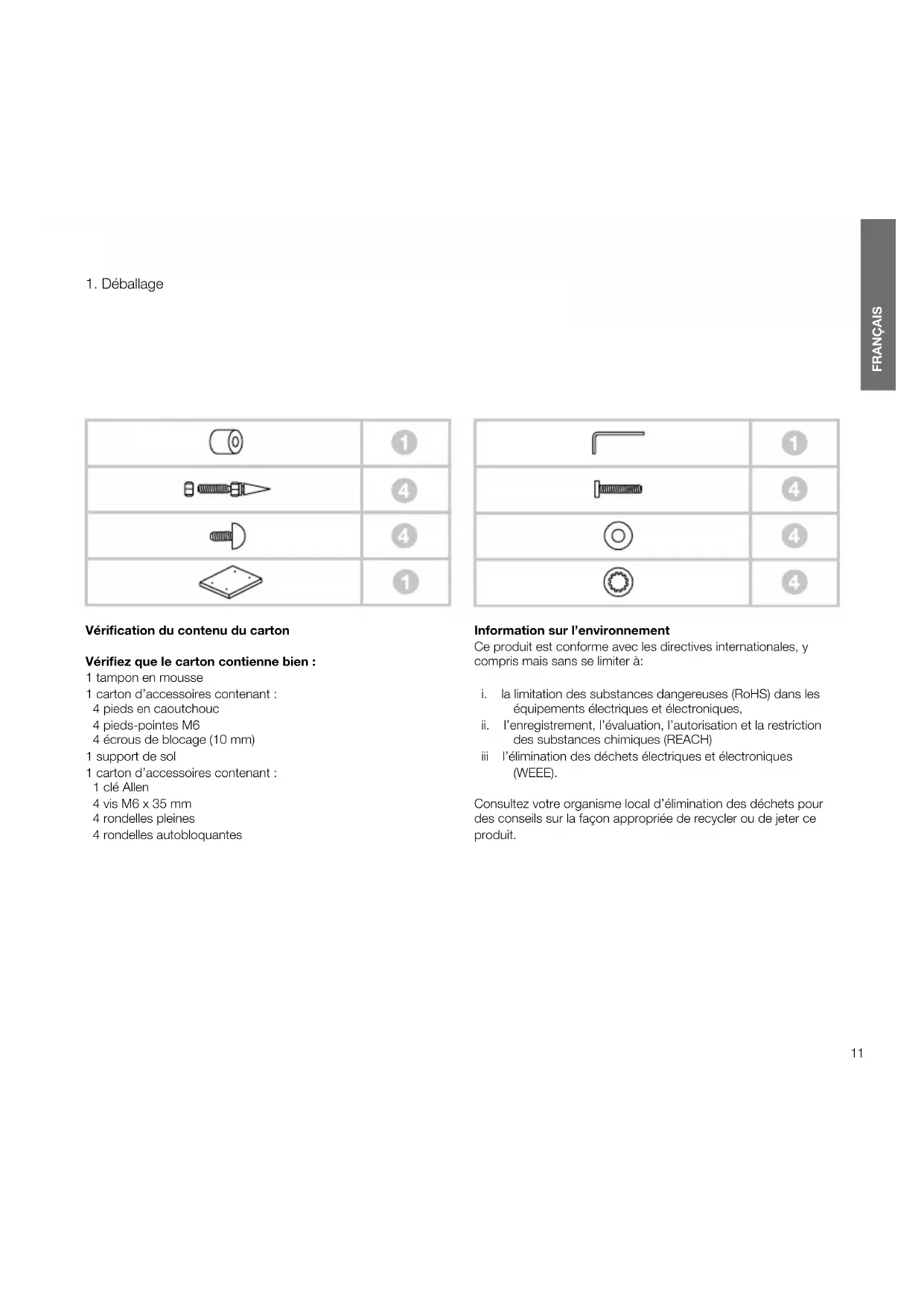 Vérication du contenu du carton Vériez que le carton contienne bien : 1 tampon en mousse 1 carton d’accessoires contenant : 4 pieds en caoutchouc 4 pieds-pointes M6 4 écrous de blocage (10 mm) 1 support de sol 1 carton d’accessoires contenant : 1 clé Allen 4 vis M6 x 35 mm 4 rondelles pleines 4 rondelles autobloquantes Information sur l’environnement Ce produit est conforme avec les directives internationales, y compris mais sans se limiter à: