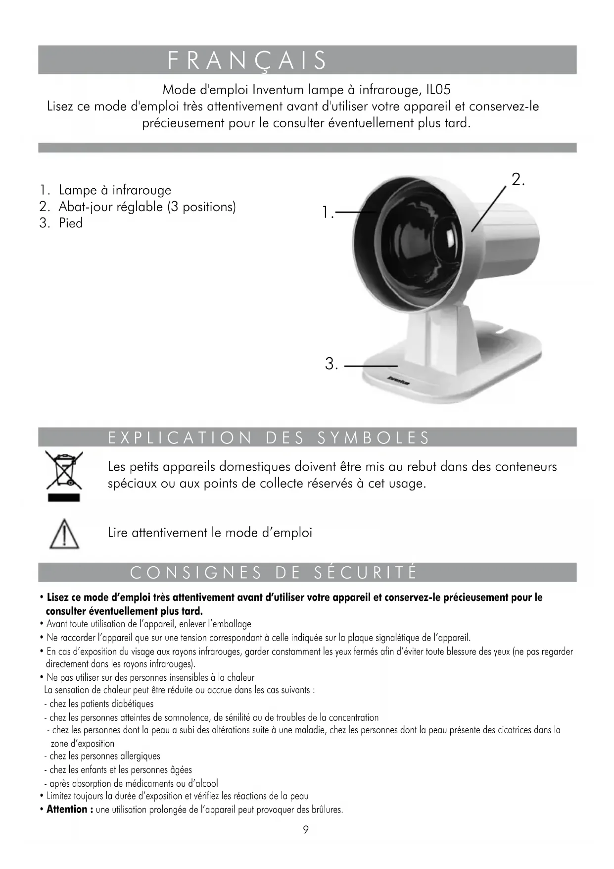 Mode d'emploi Inventum lampe à infrarouge, IL05 Lisez ce mode d'emploi très attentivement avant d'utiliser votre(AP)appeil et conserveze-le précieusement pour le consulter eventuellement plus tard.