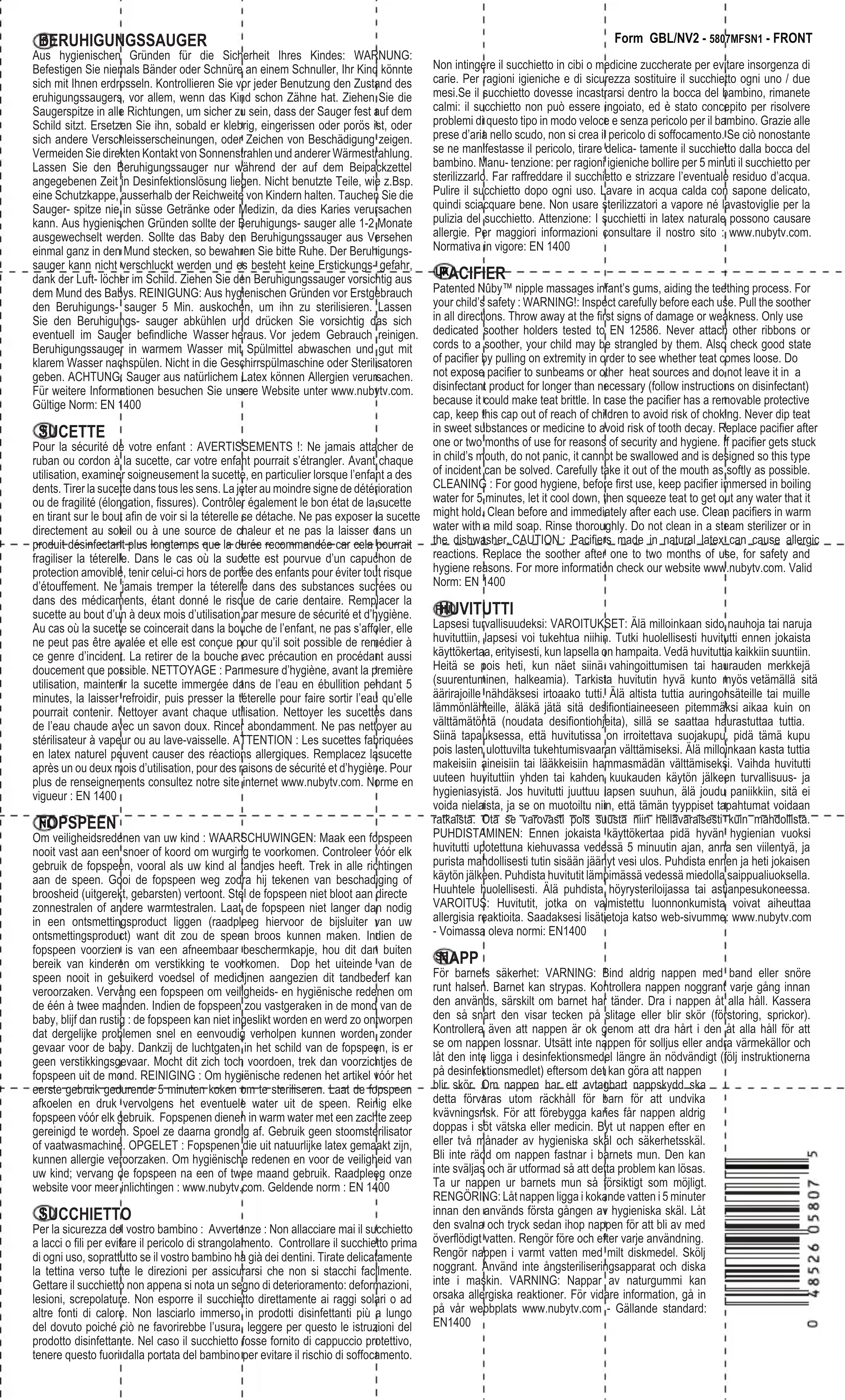 Pour la sécurité de votre enfant : AVERTISSEMENTS !: Ne jamais attacher de ruban ou cordon à la sucette, car cette enfant pourrait s'étrangler. Avant chaque utilisation, examiner soigneusement la sucette, en particulier lorsque l'enfant a des dents. Tirer la sucette dans tous les sens. La jeter au moindre signe de déterioration ou de fragilité (élargissement, fissures). Contrôler également le bon état de la sucette en tirant sur le bout afin de voir si la tétine se détache. Ne pas exposer la sucette directement au soleil ou à une source de chaleur et ne pas la laisser dans un produit désinfectant plus longtemps que la durée recommandée car cela pourrait fragiliser la tétine. Dans le cas où la sucette est pourvue d'un capuchon de protection amovible, tenir celui-ci hors de portée des enfants pour éviter tout risque d'étouffement. Ne jamais tremper la tétine dans des substances sucrées ou dans des médicaments, étant donné le risque de carie dentaire. Remplacer la sucette au bout d'un à deux mois d'utilisation par mesure de sécurité et d'hygiène. Au cas où la sucette se coincerait dans la bouche de l'enfant, ne pas s'affoler, elle ne peut pas être avalée et elle est conçue pour qu'il soit possible de remédier à ce genre d'accident. La retirer de la bouche avec précaution en procédant aussi doucement que possible. NETTOYAGE : Par mesure d'hygiène, avant la première utilisation, maintenir la sucette immergée dans de l'eau en ébullition pendant 5 minutes, la laisser refroidir, puis presser la tétine pour faire sortir l'eau qu'elle pourrait contenir. Nettoyer avant chaque utilisation. Nettoyer les sucettes dans de l'eau chaude avec un savon doux. Rincer abondamment. Ne pas nettoyer au stérilisateur à vapeur ou au lave-vaisselle. ATTENTION : Les sucettes fabriquées en latex naturel peuvent causer des réactions allergiques. Remplacer la sucette après un ou deux mois d'utilisation, pour des raisons de sécurité et d'hygiène. Pour plus de renseignements consultez notre site internet www.nubytv.com. Norme en vigueur : EN 1400