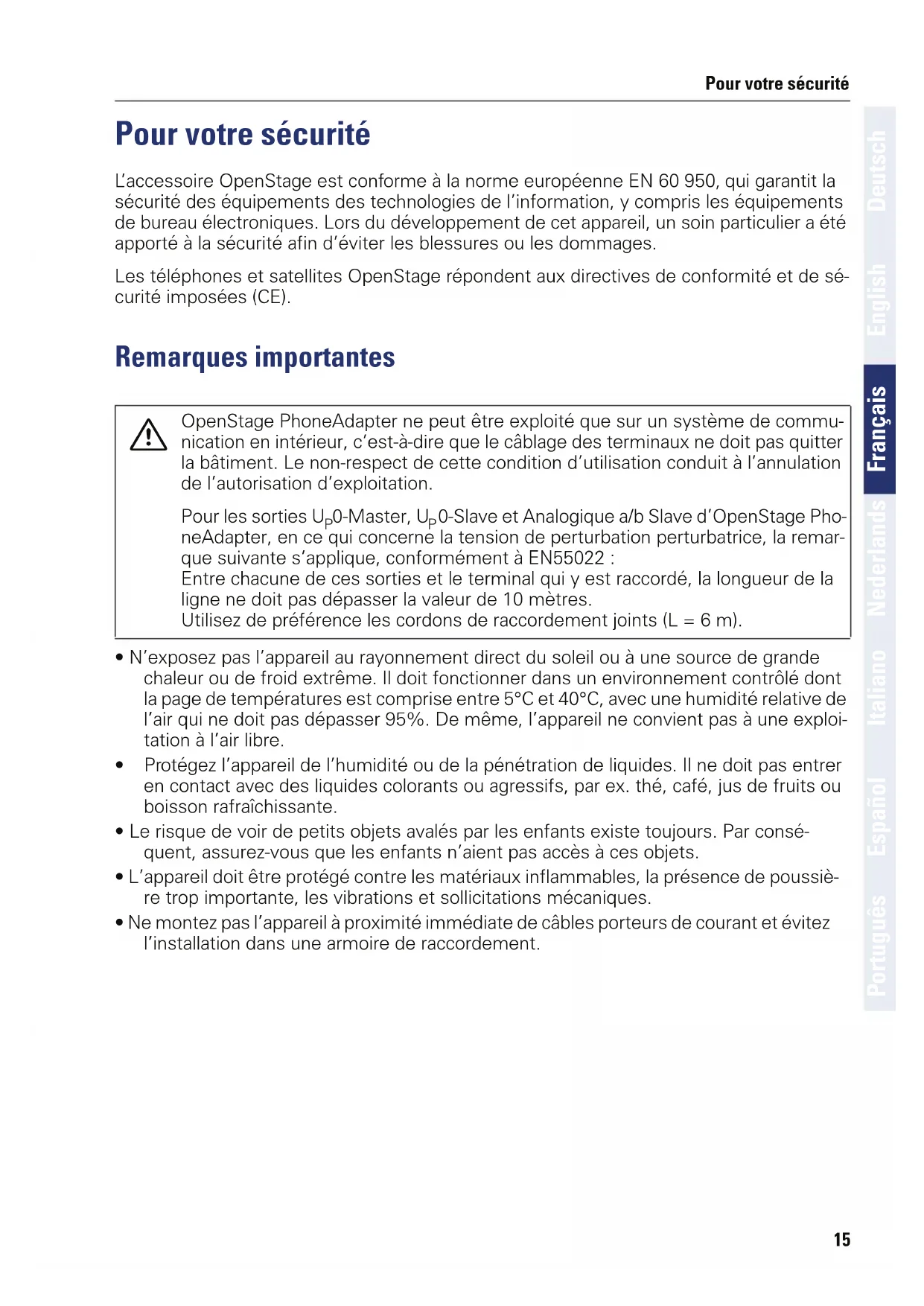 OpenStage PhoneAdapter ne peut être exploité que sur un système de communication en interieur, c'est-à-dire que le cablage des terminaux ne doit pas quitter la bâtiment. Le non-respect de cette condition d'utilisation conduit à l'annulation de l'autorisation d'exploitation.