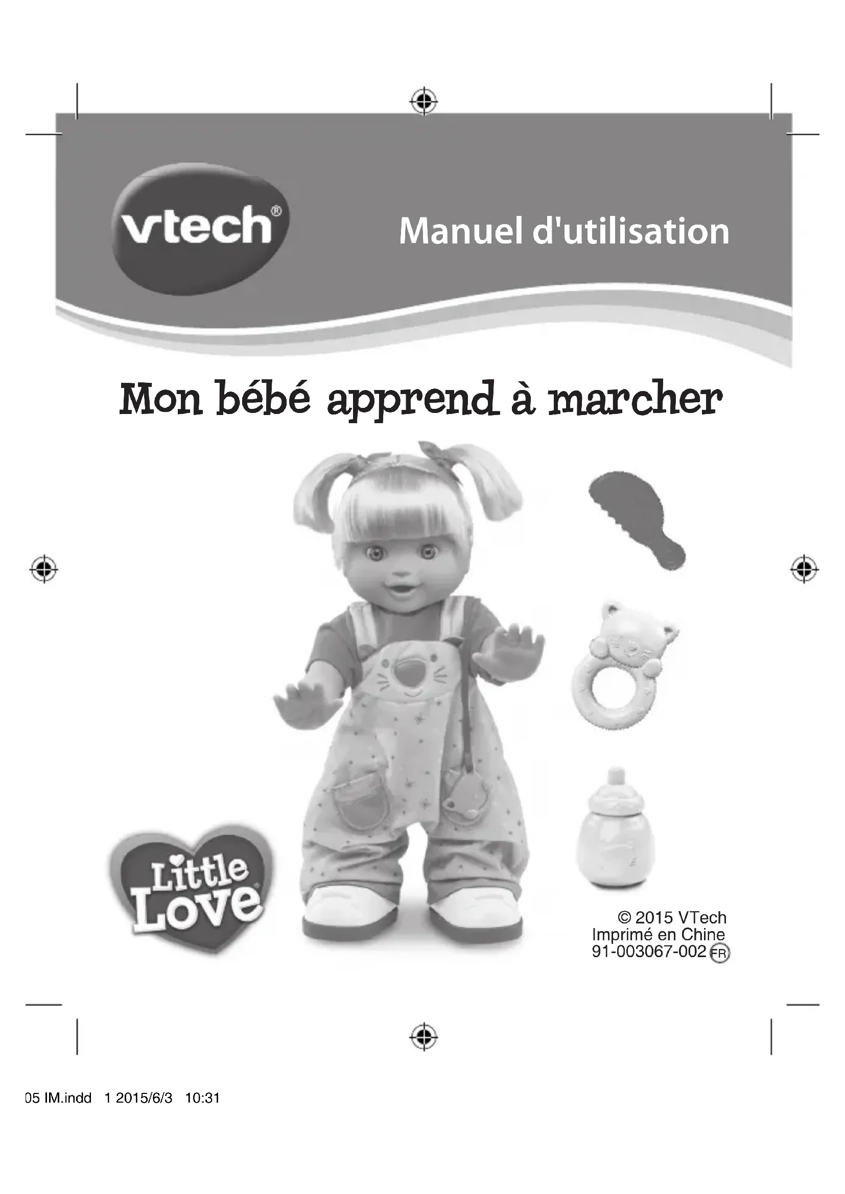, nous nous engageons à tout faire pour que les enfants grandissent dans les meilleures conditions et abordent l’avenir en toute sérénité. Nous vous remercions de la confiance que vous nous accordez dans notre démarche ludo-éducative. L’équipe VTech Pour en savoir plus : www.vtech-jouets.com 182805 IM.indd 2 2015/6/3 10:31:382 INTRODUCTION Vous venez d’acquérir Little Love - Mon bébé apprend à marcher de VTech