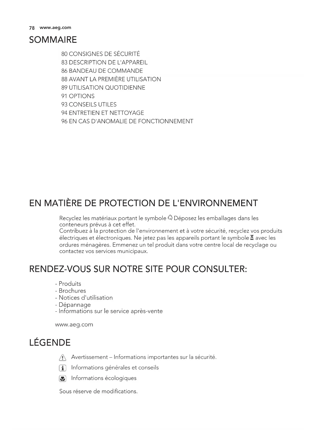 EN MATIÈRE DE PROTECTION DE L'ENVIRONNEMENT Recyclez les matériaux portant le symbole . Déposez les emballages dans les conteneurs prévus à cet effet. Contribuez à la protection de l'environnement et à votre sécurité, recyclez vos produits électriques et électroniques. Ne jetez pas les appareils portant le symbole avec les ordures ménagères. Emmenez un tel produit dans votre centre local de recyclage ou contactez vos services municipaux. RENDEZ-VOUS SUR NOTRE SITE POUR CONSULTER: - Produits - Brochures - Notices d'utilisation - Dépannage - Informations sur le service après-vente www.aeg.com LÉGENDE Avertissement – Informations importantes sur la sécurité. Informations générales et conseils Informations écologiques Sous réserve de modifications.