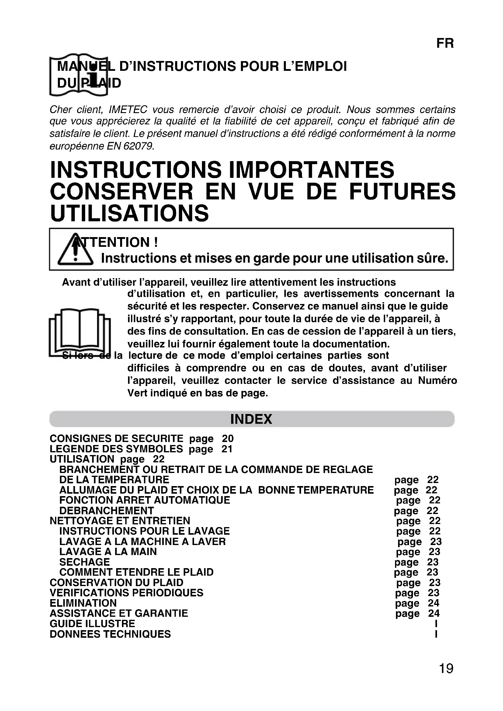 DU PLAID Cher client, IMETEC vous remercie d’avoir choisi ce produit. Nous sommes certains que vous apprécierez la qualité et la fiabilité de cet appareil, conçu et fabriqué afin de satisfaire le client. Le présent manuel d’instructions a été rédigé conformément à la norme européenne EN 62079. INSTRUCTIONS IMPORTANTES