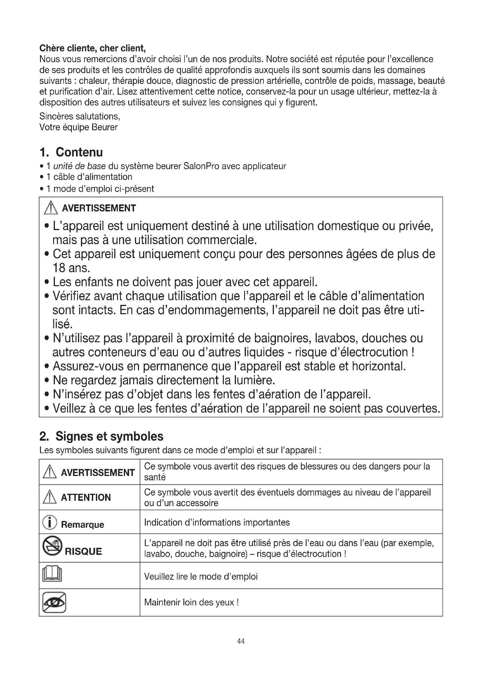 Les symboles suivants figurent dans ce mode d’emploi et sur l’appareil: AVERTISSEMENT Ce symbole vous avertit des risques de blessures ou des dangers pour la santé ATTENTION Ce symbole vous avertit des éventuels dommages au niveau de l’appareil ou d’un accessoire Remarque Indication d’informations importantes RISQUE L’appareil ne doit pas être utilisé près de l’eau ou dans l’eau (par exemple, lavabo, douche, baignoire) – risque d’électrocution! Veuillez lire le mode d’emploi Maintenir loin des yeux!45 Ne pas utiliser sur une peau bronzée ou après une exposition au soleil Élimination selon la directive relative aux déchets d’équipements élec- triques et électroniques (DEEE) Ce produit répond aux exigences des directives européennes et nationales en vigueur.