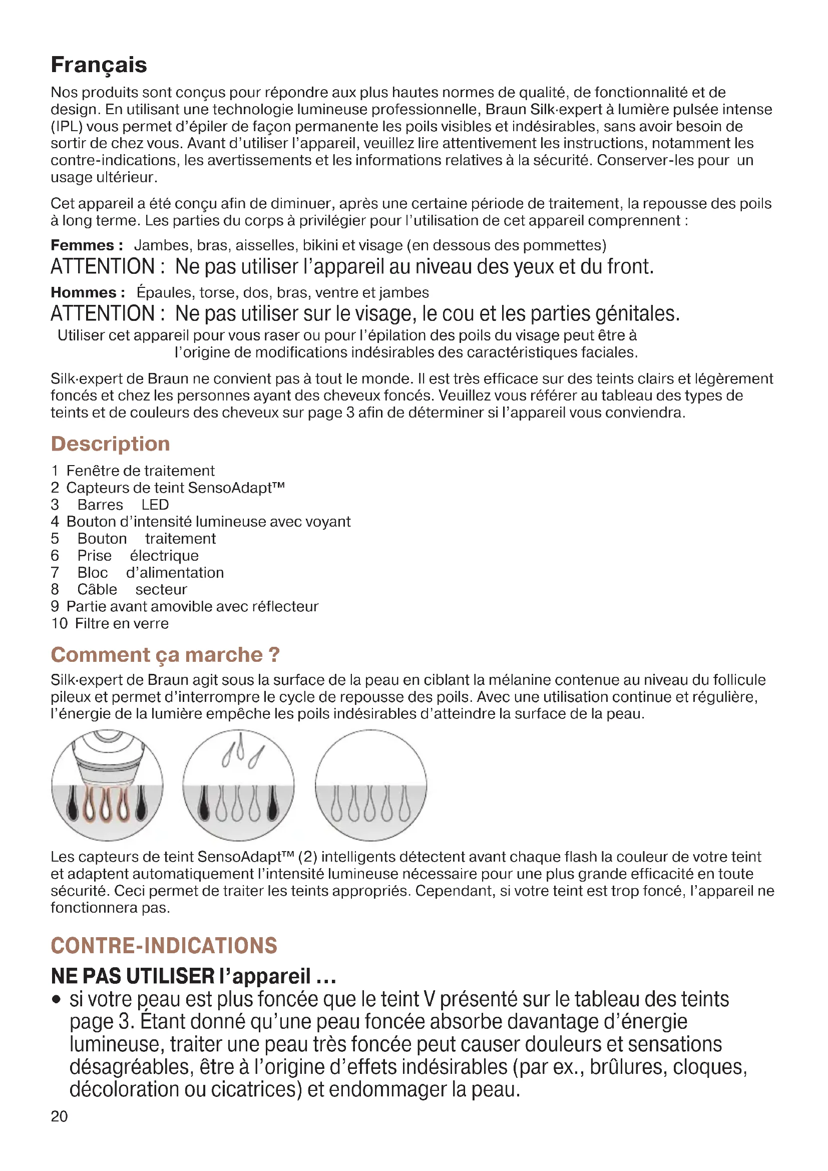 Le guide de résolution des problèmes suivant vous aidera à résoudre les problèmes qui peuvent surgir lors de l’utilisation de cet appareil. Problème Solution Les barres LED ne s’allument pas quand la fenêtre de traitement est placée sur la peau. Assurez-vous que l’appareil est branché à la prise électrique et en mode Prêt. Assurez-vous que les capteurs de teint sont bien en contact avec la peau. Si nécessaire, déplacez l’appareil de façon à ce que les deux capteurs de teint soient en contact avec la peau. 90795093_BD5001_A_S4-94.indd 2690795093_BD5001_A_S4-94.indd 26 04.04.16 09:0404.04.16 09:04 CSS APPROVED Effective Date 8Apr2016 GMT - Printed 27Sep2016 Page 26 of 9427 L’appareil ne fonctionne pas sur les zones de petite taille. Les deux capteurs de teint doivent être en contact avec la peau. Si la zone à traiter est trop petite ou incurvée, le teint ne peut pas être reconnu et l’appareil ne peut pas être activé. Repositionnez l’appareil pour vous assurer que les deux capteurs sont en contact avec la peau. Sur la barre LED, seule la première LED s’allume en rouge. Lecture du teint non valide. Votre peau est trop claire ou trop foncée. Pour des raisons de sécurité, l’appareil ne peut pas être activé. La première LED de la barre LED flashe une lumière blanche. L’appareil est en mode ATTENTE. Pour réactiver, il suffit d’appuyer sur n’importe quel bouton. La première LED de la barre LED flashe une lumière rouge. Le réflecteur amovible de la fenêtre de traitement (9) a été ôté. Replacez-le. Les barres LED affichent un schéma inconnu : une LED rouge allumée et des LED individuelles blanches. Erreur de l’appareil. L’appareil ne fonctionnera pas. Ôtez et raccordez le bloc d’alimentation. Si l’erreur persiste, contactez un centre de service Braun pour réparation. Toutes les LED blanches flashent. Fin de vie du produit. Le nombre de flashes maximum (300 000) a été atteint. L’appareil est cassé, fissuré ou semble défectueux. NE PAS UTILISER si l’appareil, le câble secteur ou l’alimentation sont endommagés. Si vous avez le moindre doute quant à la sécurité de l’appareil ou si vous soupçonnez qu’il est endommagé d’une manière ou d’une autre, ne l’utilisez pas. Mise au rebut Ce produit contient des déchets électroniques recyclables. Pour protéger l’environnement, ne le jetez pas dans les ordures ménagères, déposez-le dans un centre de recyclage approprié. Sujet à toute modification sans préavis. Garantie Nous accordons une garantie de 2 ans sur ce produit, à partir de la date d’achat. Pendant la durée de la garantie, Braun prendra gratuitement à sa charge la réparation des vices de fabrication ou de matière en se réservant le droit de décider si certaines pièces doivent être réparées ou si l’appareil lui-même doit être échangé. Cette garantie s’étend à tous les pays où cet appareil est commercialisé par Braun ou son distributeur exclusif. Cette garantie ne couvre pas : les dommages occasionnés par une utilisation inadéquate, l’usure normale (par exemple, grille et bloc-couteaux) ainsi que les défauts d’usures qui ont un effet négligeable sur la valeur ou l’utilisation de l’appareil. Cette garantie devient caduque si des réparations ont été effectuées par des personnes non agréées par Braun et si des pièces de rechange ne provenant pas de Braun ont été utilisées. Pour toute réclamation intervenant pendant la période de garantie, retournez ou rapportez l’appareil ainsi que l’attestation de garantie à votre revendeur ou à un Centre Service Agréé Braun. Veuillez vous référer à www.service.braun.com ou appeler le 0 800 944 802 (service consommateurs – service & appel gratuits) pour connaître le Centre Service Agrée Braun le plus proche de chez vous. Clause spéciale pour la France Outre la garantie contractuelle exposée ci-dessus, nos clients bénéficient de la garantie légale des vices caches prévue aux articles 1641 et suivants du Code civil. 90795093_BD5001_A_S4-94.indd 2790795093_BD5001_A_S4-94.indd 27 04.04.16 09:0404.04.16 09:04 CSS APPROVED Effective Date 8Apr2016 GMT - Printed 27Sep2016 Page 27 of 9428 Español Nuestros productos han sido diseñados con los más altos estándares de calidad, funcionalidad y diseño. El sistema de Braun Silk·expert con Luz Intensa Pulsada (LIP) usa la tecnología de luz profesional y permite la eliminación permanente del vello visible no deseado de una manera cómoda en casa. Antes de usar el dispositivo, lea las instrucciones detenidamente, incluidas todas las contraindicaciones, advertencias e información de seguridad, y consérvelas para consultarlas en el futuro. Este dispositivo ha sido diseñado para reducir el crecimiento del vello a largo plazo tras un cierto período de tratamiento. Las áreas del cuerpo ideales para el tratamiento incluyen: Mujeres: Piernas, brazos, axilas, línea del biquini y rostro (bajo los pómulos) PRECAUCIÓN: No use el dispositivo cerca de los ojos ni en la frente. Hombres: Hombros y zona inferior (pecho, espalda, brazos, estómago, piernas) PRECAUCIÓN: No use el dispositivo en el rostro, el cuello o la zona genital. El uso del dispositivo en la barba masculina o en el vello facial podría dar lugar a resultados permanentes o irregulares no deseados que cambien las características faciales. El dispositivo Braun Silk·expert no es adecuado para todo el mundo. Es más efectivo en pieles de tono claro y medio, y en el vello oscuro. Consulte la tabla de tonos de piel y color de vello en la página 3 para comprobar si el dispositivo es adecuado para usted. Descripción 1 Ventana de tratamiento 2 Sensores SensoAdapt™ de detección del tono de piel 3 Barras de LED 4 Botón de intensidad de luz con señal luminosa 5 Botón de tratamiento 6 Toma de corriente 7 Fuente de alimentación 8 Cable de alimentación 9 Parte delantera desmontable con reflector 