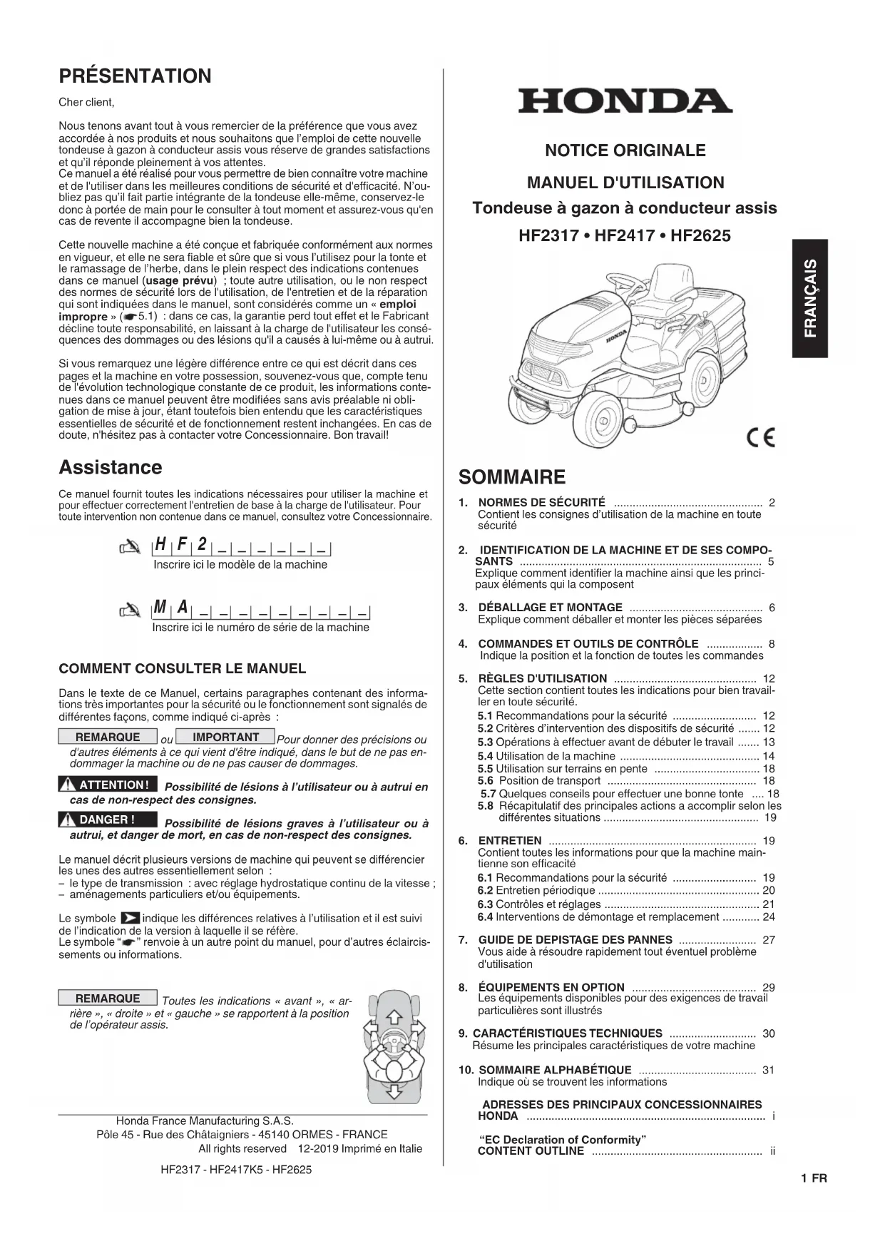 Indique où se trouvent les informations ADRESSES DES PRINCIPAUX CONCESSIONNAIRES HONDA ............................................................................. i “EC Declaration of Conformity” CONTENT OUTLINE ....................................................... ii 1 FR NOTICE ORIGINALE MANUEL D'UTILISATION HF2317 • HF2417 • HF2625 Tondeuse à gazon à conducteur assis Honda France Manufacturing S.A.S.Pôle 45 - Rue des Châtaigniers - 45140 ORMES - FRANCEAll rights reservedInscrire ici le modèle de la machine H F 2 _ _ _ _ _ _ Inscrire ici le numéro de série de la machine M A _ _ _ _ _ _ _ _ _ 12-2019 Imprimé en ItalieHF2317 - HF2417K5 - HF2625 FRANÇAISdommager l’ensemble des organes de coupe et le moteur (cailloux, branches, ls de fer, os, etc..).