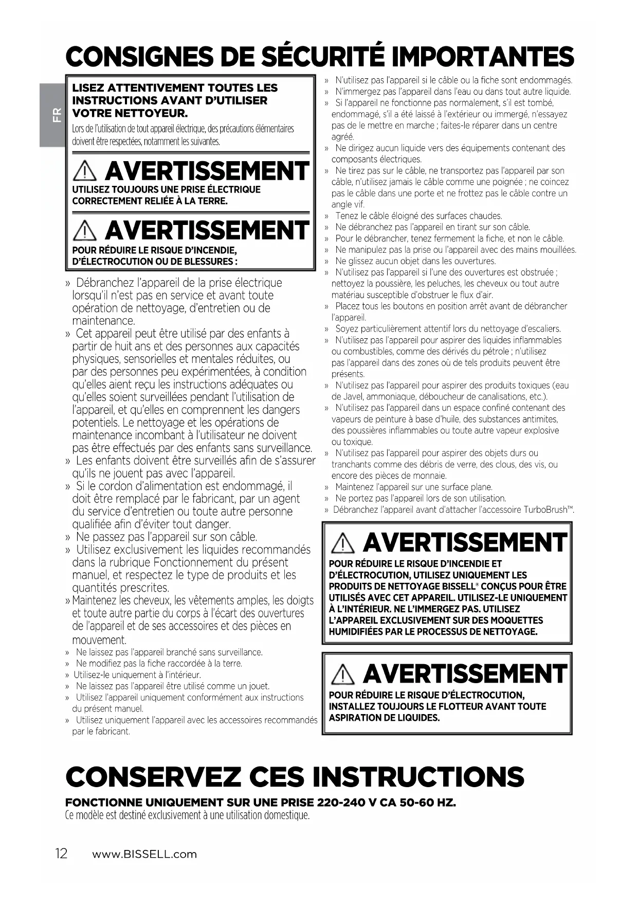 Merci d’avoir choisi un nettoyeur BISSELL Nous sommes ravis que vous ayez acheté un nettoyeur BISSELL. Laconception et la fabrication de ce système de nettoyage ménager complet haute technologie résultent de notre longue expérience dans le domaine de l’entretien des sols. Gage de sa qualité, votre nettoyeur BISSELL est assorti d’une garantie limitée de deux ans. Vous bénéficiez également des compétences et du dévouement de notre service client, qui vousapportera une aide rapide en cas de problème. Mon arrière-grand-père a inventé le balai mécanique en1876. BISSELL est aujourd’hui l’un des leaders mondiaux de la conception, de la fabrication et de l’entretien de produits d’entretien ménagers de haute qualité, comme votre nettoyeur BISSELL. Toute l’équipe de BISSEL vous renouvelle ses remerciements pour votre achat. Mark J. Bissell Président Directeur Général Définition des symboles AVERTISSEMENT RISQUE D’INCENDIE, D’ÉLECTROCUTION OU DE BLESSURES. ASTUCE REMARQUE OU CONSEIL NON INDISPENSABLE, MAIS SUSCEPTIBLE D’AMÉLIORER L’UTILISATION DE L’APPAREIL. MANUEL LISEZ LE MANUEL DE L’UTILISATEUR POUR CONNAÎTRE L’ENSEMBLE DES INSTRUCTIONS DE SÉCURITÉ ET D’UTILISATION. DEEE LORSQU’IL NE FONCTIONNERA PLUS, NE JETEZ PAS L’APPAREIL AVEC LES ORDURES MÉNAGÈRES MAIS DÉPOSEZ-LE DANS UN POINT DE COLLECTE PRÉVU À CET EFFET, OÙ IL POURRA ÊTRE RECYCLÉ. VOUS CONTRIBUEREZ AINSI À LA PROTECTION DE L’ENVIRONNEMENT.FR