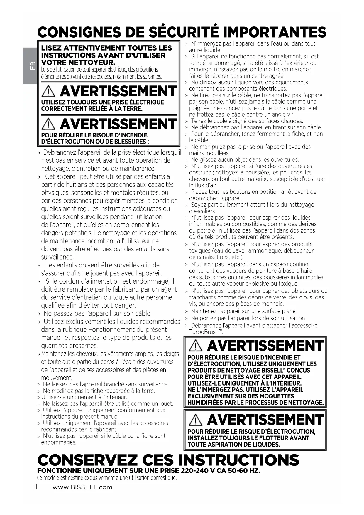 FONCTIONNE UNIQUEMENT SUR UNE PRISE 220-240VCA 50-60HZ. Ce modèle est destiné exclusivement à une utilisation domestique.FR