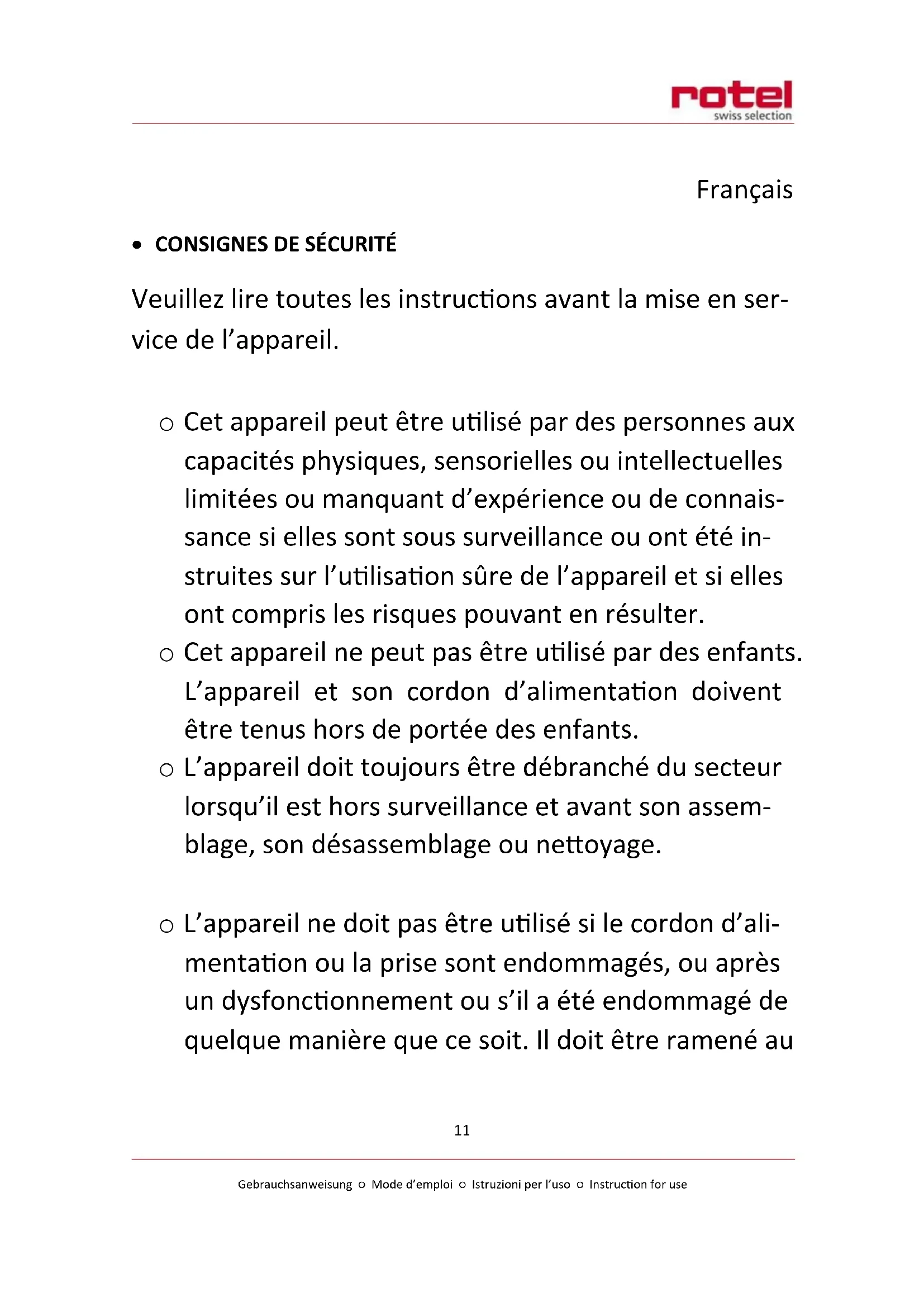Veuillez lire toutes les instructions avant la mise en ser- vice de l’appareil. o Cet appareil peut être utilisé par des personnes aux capacités physiques, sensorielles ou intellectuelles limitées ou manquant d’expérience ou de connais- sance si elles sont sous surveillance ou ont été in- struites sur l’utilisation sûre de l’appareil et si elles ont compris les risques pouvant en résulter. o Cet appareil ne peut pas être utilisé par des enfants. L’appareil et son cordon d’alimentation doivent être tenus hors de portée des enfants. o L’appareil doit toujours être débranché du secteur lorsqu’il est hors surveillance et avant son assem- blage, son désassemblage ou nettoyage. o L’appareil ne doit pas être utilisé si le cordon d’ali- mentation ou la prise sont endommagés, ou après un dysfonctionnement ou s’il a été endommagé de quelque manière que ce soit. Il doit être ramené auGebrauchsanweisung ○ Mode d’emploi ○ Istruzioni per l’uso ○ Instruction for use