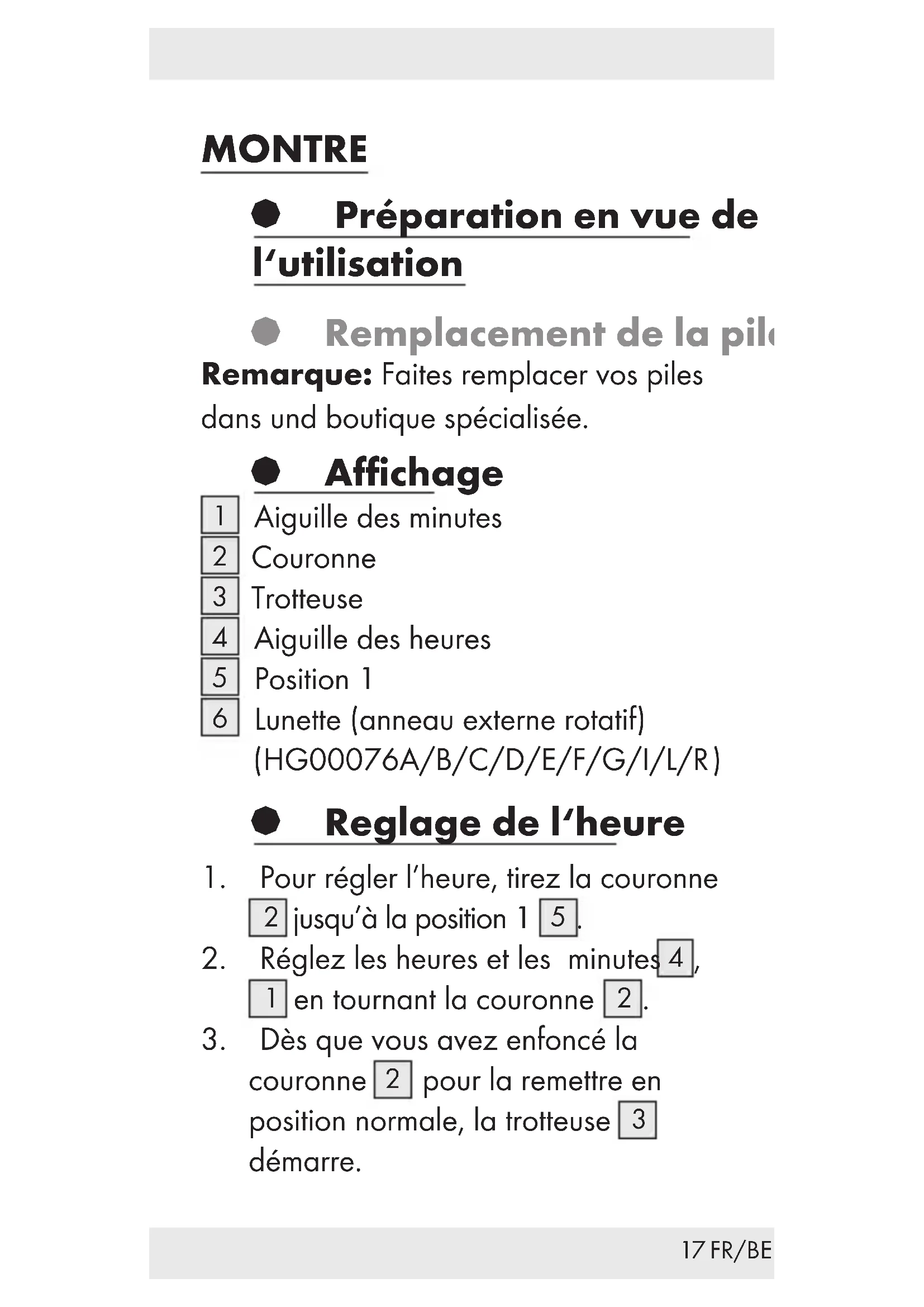 dans le sens contraire des aiguilles d‘une montre pour marquer le début d‘une mesure de temps.19 FR/BE § Nettoyage et entretien Nettoyez uniquement l’extérieur du produit, à l’aide d’un chiffon doux sec. § Traitement des déchets L‘emballage et son matériel sont exclusivement composés de matières écologiques. Les matériaux peuvent être recyclés dans les points de collecte locaux. Les possibilités de recyclage des produits usés sont à demander auprès de votre municipalité. Pour le respect de l‘environnement, lorsque vous n‘utilisez plus votre produit, ne le jetez pas avec les ordures ménagères, mais entreprenez un recyclage adapté. Pour obtenir des renseignements et des horaires d‘ouverture concernant les points de collecte, vous pouvez contacter votre administration locale.20 FR/BE Les piles défectueuses ou usées doivent être recyclées conformément à la directive 2006 / 66 / EC. Les piles et/ou l‘appareil doivent être retournés dans les centres de collecte. Pollution de l’environnement par mise au rebut incorrecte des piles ! Les piles ne doivent pas être mises au rebut dans les ordures ménagères. Elles peuvent contenir des métaux lourds toxiques et doivent être considérés comme des déchets spéciaux. Les symboles chimiques des métaux lourds sont les suivants : Cd = cadmium, Hg = mercure, Pb = plomb. Pour cette raison, veuillez toujours déposer les piles usées dans les conteneurs de recyclage communaux.21 FR/BE § Garantie L’appareil a été fabriqué selon des critères de qualité stricts et contrôlé consciencieusement avant sa livraison. En cas de défaillance, vous êtes en droit de retourner ce produit au vendeur. La présente garantie ne constitue pas une restriction de vos droits légaux. Cet appareil bénéficie d‘une garantie de 3 ans à compter de sa date d’achat. La durée de garantie débute à la date d’achat. Veuillez conserver le ticket de caisse original. Il fera office de preuve d’achat. Si un problème matériel ou de fabrication devait survenir dans les trois ans suivant la date d‘achat de ce produit, nous assurons à notre discrétion la réparation ou le remplacement de l‘appareil sans frais supplémentaires. La garantie prend fin si le produit est endommagé suite à une utilisation inappropriée ou à un entretien défaillant.22 FR/CH La garantie couvre les vices matériels et de fabrication. Cette garantie ne s‘étend pas aux pièces du produit soumises à une usure normale et qui, par conséquent, peuvent être considérées comme des pièces d‘usure, ni aux dommages sur des composants fragiles, comme des interrupteurs, des batteries et des éléments fabriqués en verre. La garantie ne couvre pas non plus la perte de l’étanchéité à l’eau. L’état d’étanchéité à l’eau n’est pas une propriété durable et fait l’objet d’une maintenance périodique. Veuillez noter que votre garantie devient caduque pour les cas suivants: ouverture et la réparation de votre montre par des personnes non autorisées.23 NL/BE HORLOGE § Ingebruikneming § De batterij vervangen Opmerking: Laat de batterijen vervangen in een speciaalzaak. § Display