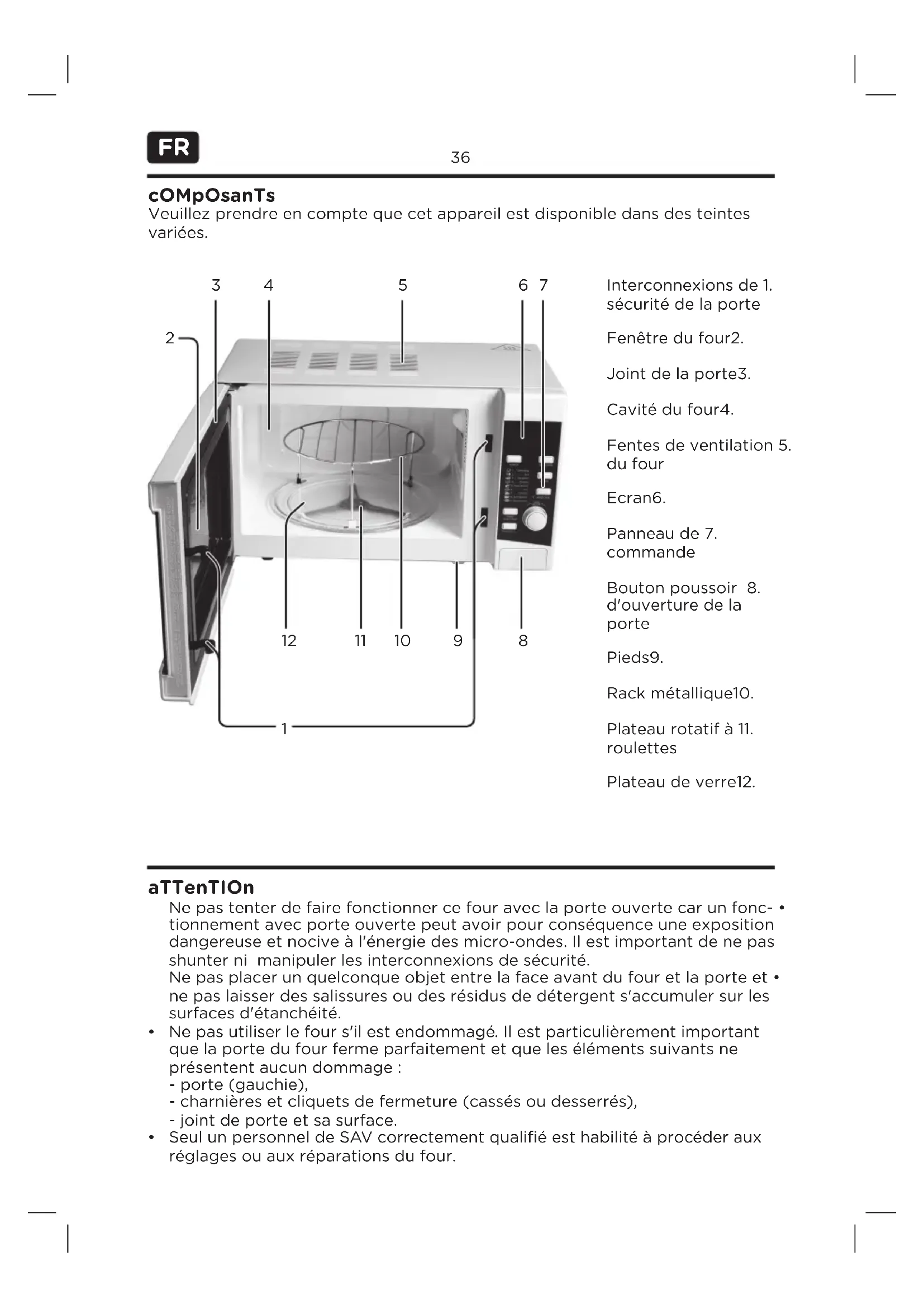 Interconnexions de 1. sécurité de la porte Fenêtre du four2. Joint de la porte3. Cavité du four4. Fentes de ventilation 5. du four Ecran6. Panneau de 7. commande Bouton poussoir 8. d'ouverture de la porte Pieds9. Rack métallique10. Plateau rotatif à 11. roulettes Plateau de verre12. aTTenTIOn cOMpOsanTs
