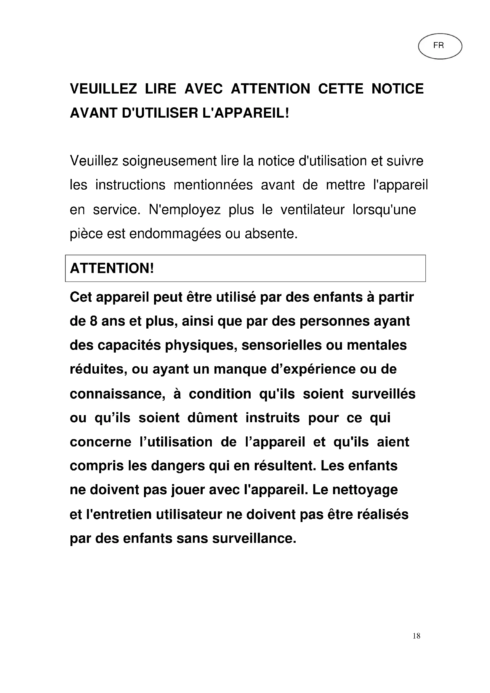 AVANT D'UTILISER L'APPAREIL! Veuillez soigneusement lire la notice d'utilisation et suivre les instructions mentionnées avant de mettre l'appareil en service. N'employez plus le ventilateur lorsqu'une pièce est endommagées ou absente. ATTENTION! Cet appareil peut être utilisé par des enfants à partir de 8 ans et plus, ainsi que par des personnes ayant des capacités physiques, sensorielles ou mentales réduites, ou ayant un manque d’expérience ou de connaissance, à condition qu'ils soient surveillés ou qu’ils soient dûment instruits pour ce qui concerne l’utilisation de l’appareil et qu'ils aient compris les dangers qui en résultent. Les enfants ne doivent pas jouer avec l'appareil. Le nettoyage et l'entretien utilisateur ne doivent pas être réalisés par des enfants sans surveillance. FR19 N´utilisez l´appareil que pour l´usage prévu, expliqué dans le mode d´emploi Vérifiez que la tension d'alimentation de la fiche est conforme à celle indiquée sur la plaque signalétique (220-240V - 50/60Hz). Le fil électrique ne doit pas être recouvert. Branchez l'appareil dans un endroit où personne ne peut trébucher sur le fil. Vérifiez que l´appareil soit sur une surface stable lors du fonctionnement. Retirez la fiche de la prise lorsque vous n'utilisez pas l'appareil. Veuillez ne pas tirer sur le fil mais sur la fiche. Assurez-vous de l'absence d'objets à proximité du ventilateur, susceptibles d'empêcher l'oscillation. Ne passez jamais un doigt, un crayon ou un autre objet à travers la grille de protection pendant le fonctionnement de l´appareil Veillez à ce qu'il n'y ait pas de rideaux, nappes, vêtements, cheveux ou quoique ce soit de semblable, à côté de l'appareil. Ceux-ci pourraient être aspirés par20 l'orifice du ventilateur et ainsi, engendrer des dommages ou des blessures. Ne mettez jamais l´appareil en marche lorsque le câble ou la fiche d´alimentation sont endommagés ou ne fonctionnent pas correctement ou bien encore endommagés de quelle que manière qu´il soit Vérifiez avant chaque utilisation que le câble d´alimentation électrique ne montre pas de fissures ou d´autres traces d´usure et faîtes contrôler l´appareil et changer le câble d´alimentation s´il y a lieu. Veuillez-vous adresser à notre service après-vente ou à un autre représentant agréé. Cet appareil est destiné exclusivement à l'exploitation à l'intérieur L'appareil, la fiche tout comme le câble ne doivent pas entrer en contact avec de l'eau ou être pulvérisés avec un liquide. N'utilisez pas l'appareil à proximité d'une baignoire, d'une douche, d'une piscine ou dans une buanderie Évitez d'exposer l'appareil aux rayons directs du soleil ou le faire fonctionner à côté d'une fenêtre.21 N'exploitez pas l'appareil avec l'autre régulateur de vitesse à semi-conducteur (par ex. gradateur). Le ventilateur doit être debout lors de son exploitation et jamais couché sur le côté. N´allumez jamais l´appareil lorsque celui-ci se trouve à proximité de gaz explosifs ou inflammables Débranchez le câble d´alimentation de la prise de courant lors du nettoyage de l´appareil Ne jamais réparer votre appareil vous-même. Si une réparation est nécessaire, s'il vous plaît contactez votre revendeur. INSTRUCTIONS D'UTILISATION