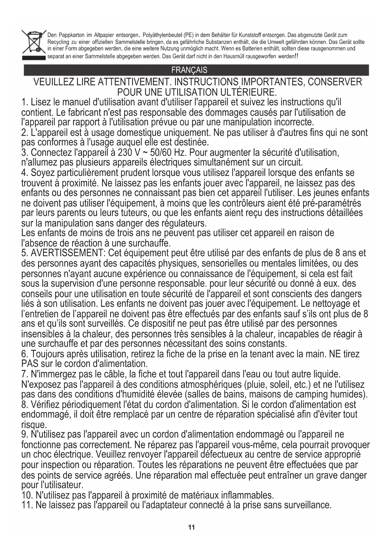 11. Ne laissez pas l'appareil ou l'adaptateur connecté à la prise sans surveillance.12