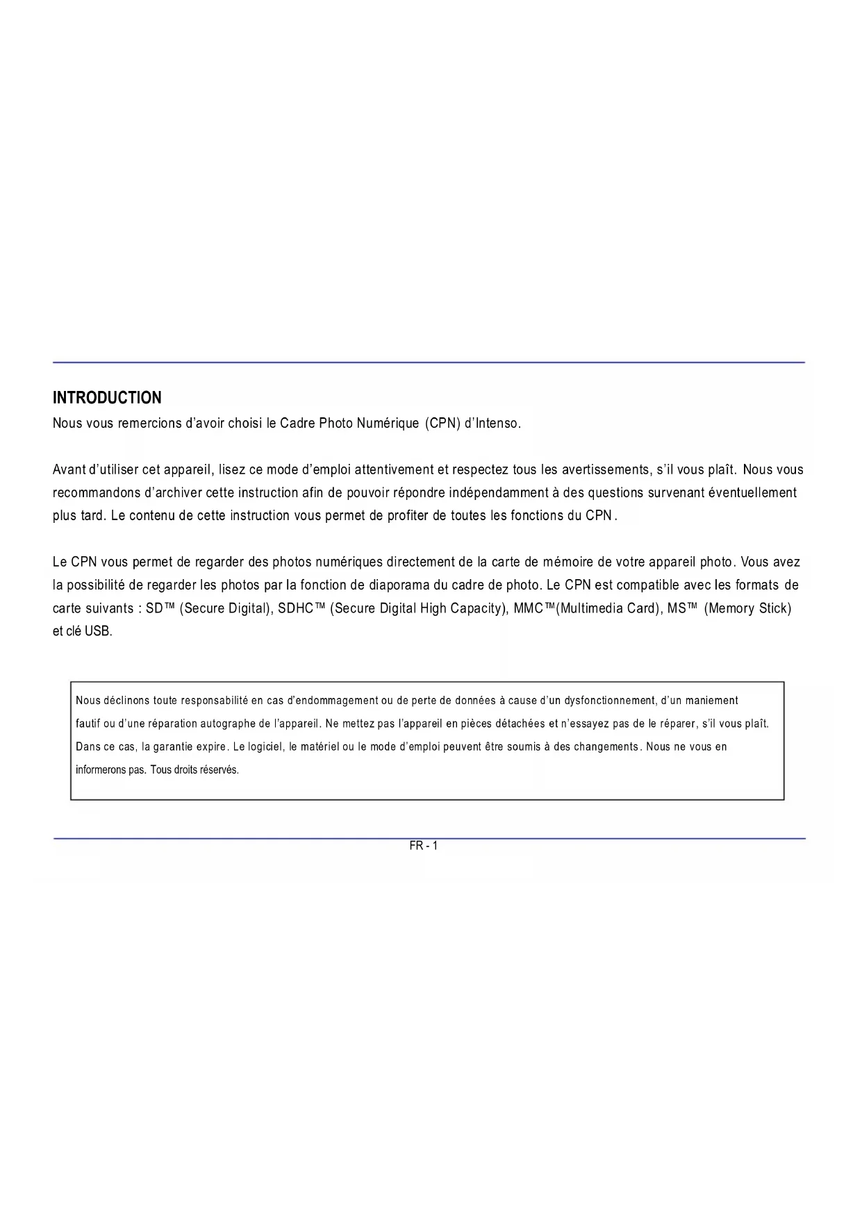 Nous vous remercions d'avoir choisi le Cadre Photo Numérique (CPN) d'Intenso.