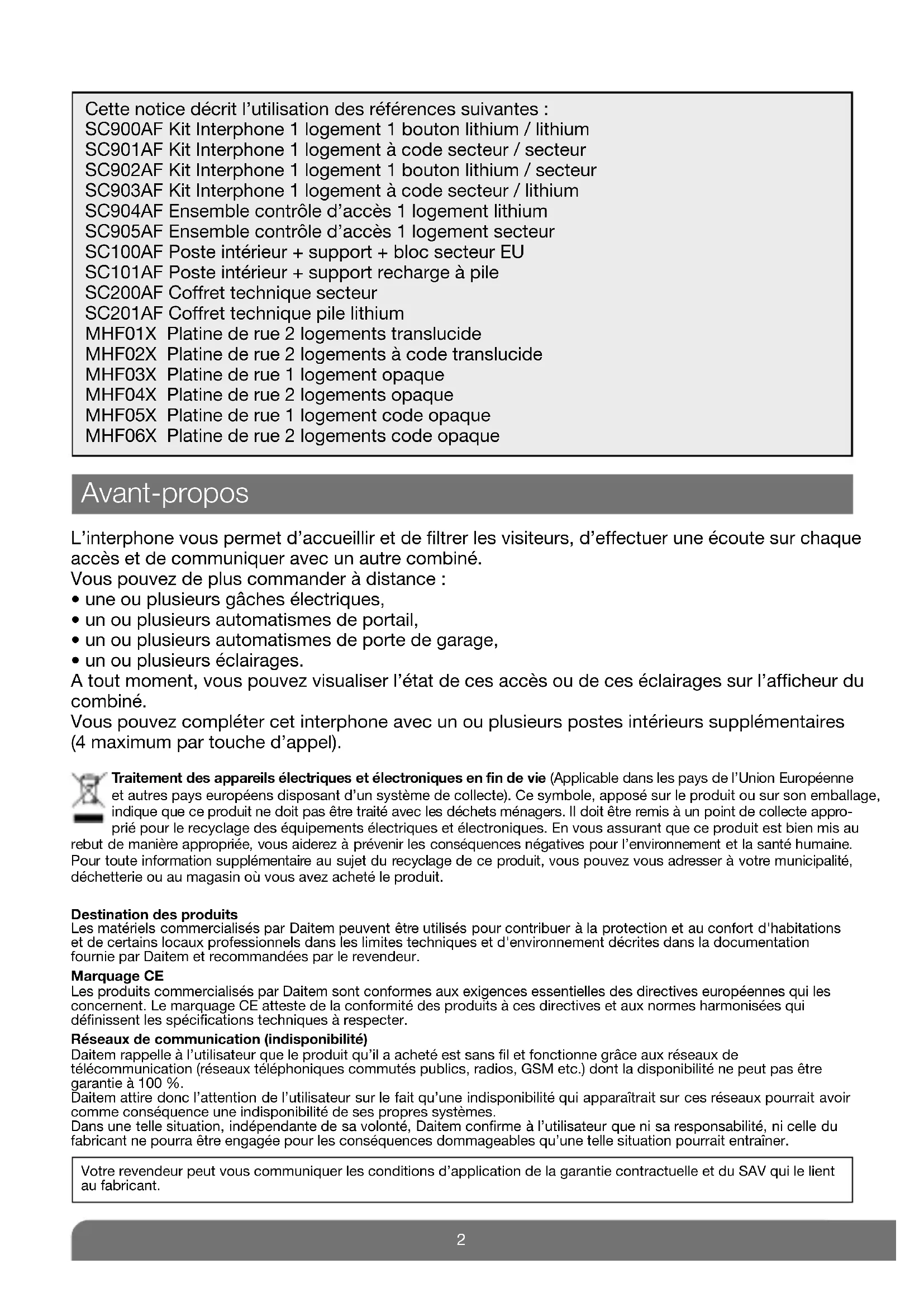- un ou plusieurs éclairages. A tout moment, vous pouvez visualiser l’état de ces accès ou de ces éclairages sur l’afficheur du combiné. Vous pouvez compléter cet interphone avec un ou plusieurs postes intérieurs supplémentaires (4 maximum par touche d’appel). Destination des produits Les matériels commercialisés par Daitem peuvent être utilisés pour contribuer à la protection et au confort d'habitations et de certains locaux professionnels dans les limites techniques et d'environnement décrites dans la documentation fournie par Daitem et recommandées par le revendeur. Marquage CE Les produits commercialisés par Daitem sont conformes aux exigences essentielles des directives européennes qui les concernent. Le marquage CE atteste de la conformité des produits à ces directives et aux normes harmonisées qui définissent les spécifications techniques à respecter. Réseaux de communication (indisponibilité) Daitem rappelle à l’utilisateur que le produit qu’il a acheté est sans fil et fonctionne grâce aux réseaux de télécommunication (réseaux téléphoniques commutés publics, radios, GSM etc.) dont la disponibilité ne peut pas être garantie à 100 %. Daitem attire donc l’attention de l’utilisateur sur le fait qu’une indisponibilité qui apparaîtrait sur ces réseaux pourrait avoir comme conséquence une indisponibilité de ses propres systèmes. Dans une telle situation, indépendante de sa volonté, Daitem confirme à l’utilisateur que ni sa responsabilité, ni celle du fabricant ne pourra être engagée pour les conséquences dommageables qu’une telle situation pourrait entraîner. Votre revendeur peut vous communiquer les conditions d’application de la garantie contractuelle et du SAV qui le lient au fabricant. Cette notice décrit l’utilisation des références suivantes : SC900AF Kit Interphone 1 logement 1 bouton lithium / lithium SC901AF Kit Interphone 1 logement à code secteur / secteur SC902AF Kit Interphone 1 logement 1 bouton lithium / secteur SC903AF Kit Interphone 1 logement à code secteur / lithium SC904AF Ensemble contrôle d’accès 1 logement lithium SC905AF Ensemble contrôle d’accès 1 logement secteur SC100AF Poste intérieur + support + bloc secteur EU SC101AF Poste intérieur + support recharge à pile SC200AF Coffret technique secteur SC201AF Coffret technique pile lithium MHF01X Platine de rue 2 logements translucide MHF02X Platine de rue 2 logements à code translucide MHF03X Platine de rue 1 logement opaque MHF04X Platine de rue 2 logements opaque MHF05X Platine de rue 1 logement code opaque MHF06X Platine de rue 2 logements code opaque Traitement des appareils électriques et électroniques en fin de vie (Applicable dans les pays de l’Union Européenne et autres pays européens disposant d’un système de collecte). Ce symbole, apposé sur le produit ou sur son emballage, indique que ce produit ne doit pas être traité avec les déchets ménagers. Il doit être remis à un point de collecte appro- prié pour le recyclage des équipements électriques et électroniques. En vous assurant que ce produit est bien mis au rebut de manière appropriée, vous aiderez à prévenir les conséquences négatives pour l’environnement et la santé humaine. Pour toute information supplémentaire au sujet du recyclage de ce produit, vous pouvez vous adresser à votre municipalité, déchetterie ou au magasin où vous avez acheté le produit. Avant-propos3 Sommaire