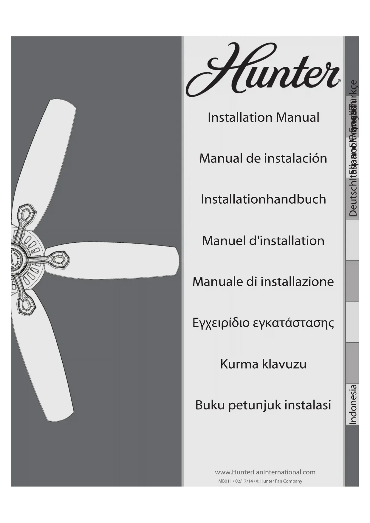 Francais Nettoyage et Entretien Soins des finis : Nettoyer à l’aide d’une brosse douce ou d’un chiffon non pelucheux pour éviter de rayer le fini. Un bec à brosse d’aspirateur peut enlever le plus gros de la poussière. Des taches de surface ou une accumulation de saleté et de poussière peuvent être facilement enlevées à l’aide d’un détergent doux et d’un linge légèrement humide. Vous pouvez utiliser un produit pour artiste, mais jamais de décapants car ils endommageraient le fini. Soins des pales : Il faut nettoyer les pales fini bois avec un chiffon à polir pour meubles. De temps en temps, une légère couche de poli à meubles peut être appliquée pour la protection et la beauté. Il faut nettoyer les pales peintes et ultra brillantes de la même manière que le fini du ventilateur. Si vous avez besoin de pièces ou d’aide, communiquez avec votre revendeur Hunter Fan ou rendez-nous visite sur notre site Web au: http://www.HunterFanInternational.com. Italiano Pulizia e Manutenzione Cura delle finiture: Per la pulizia utilizzare una spazzola morbida o un panno non peloso per evitare di graffiare la finitura. È possibile rimuovere la polvere più ostinata con il beccuccio a spazzola dell’aspirapolvere. Le macchie superficiali e gli accumuli di polvere e sporco possono essere rimossi facilmente con un detergente neutro e un panno inumidito. È possibile usare agenti antistatici, ma non detersivi abrasivi che danneggerebbero le finiture. Cura delle pale: Le pale con finitura in legno devono essere pulite con panni per spolverare il legno. Di tanto in tanto è possibile applicare uno strato sottile di lucido per mobili per una maggiore protezione e lucentezza. Le pale con finitura laccata lucida vanno pulite come le finiture del ventilatore. Per pezzi di ricambio o assistenza contattare il rivenditore Hunter Fan o visitate il nostro sito Web all’indirizzo: http://www.HunterFanInternational.com.