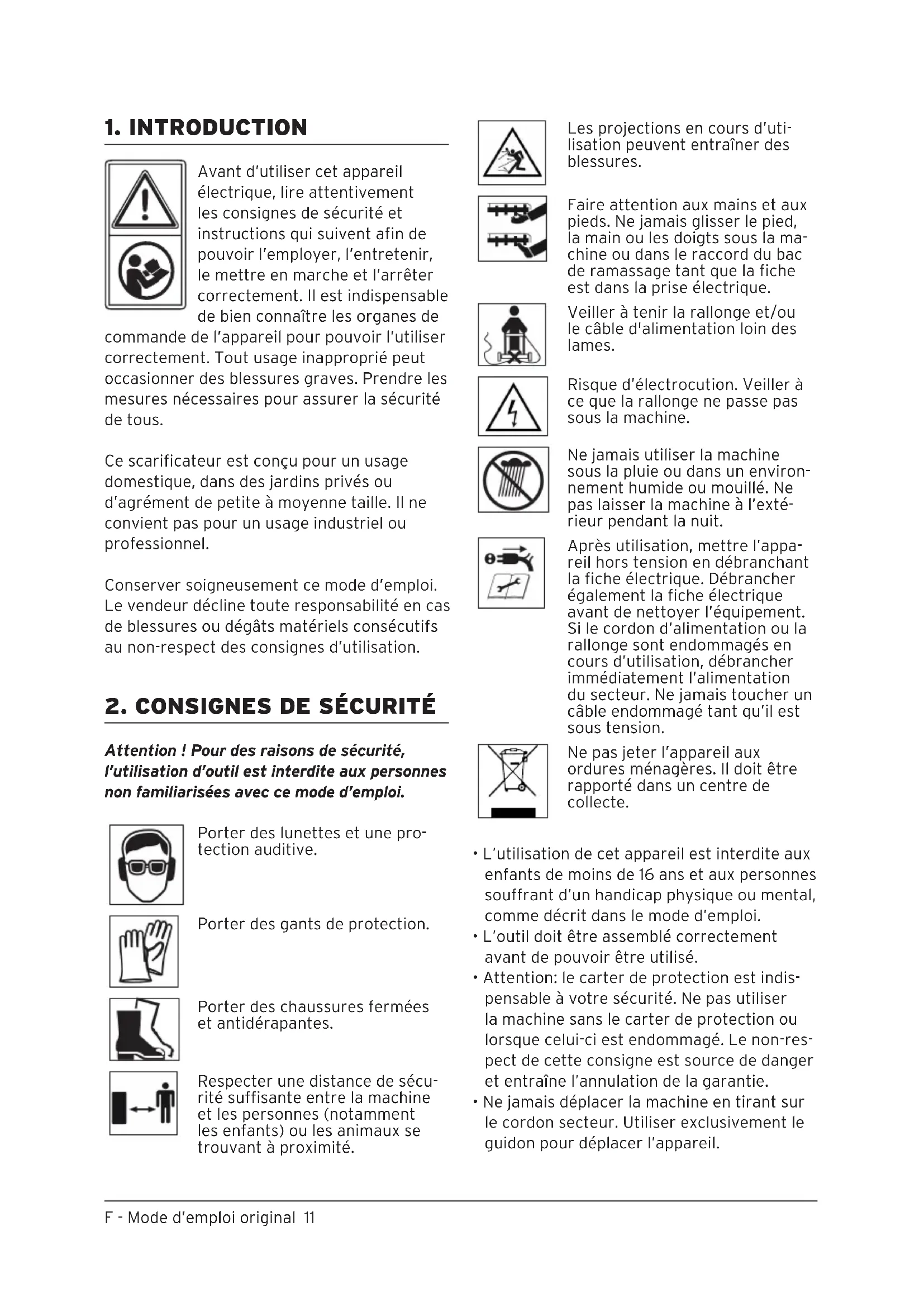 Ce scarificateur est conçu pour un usage domestique, dans des jardins privés ou d'agrément de petite à moyenne taille. Il ne convient pas pour un usage industriel ou professionnel.