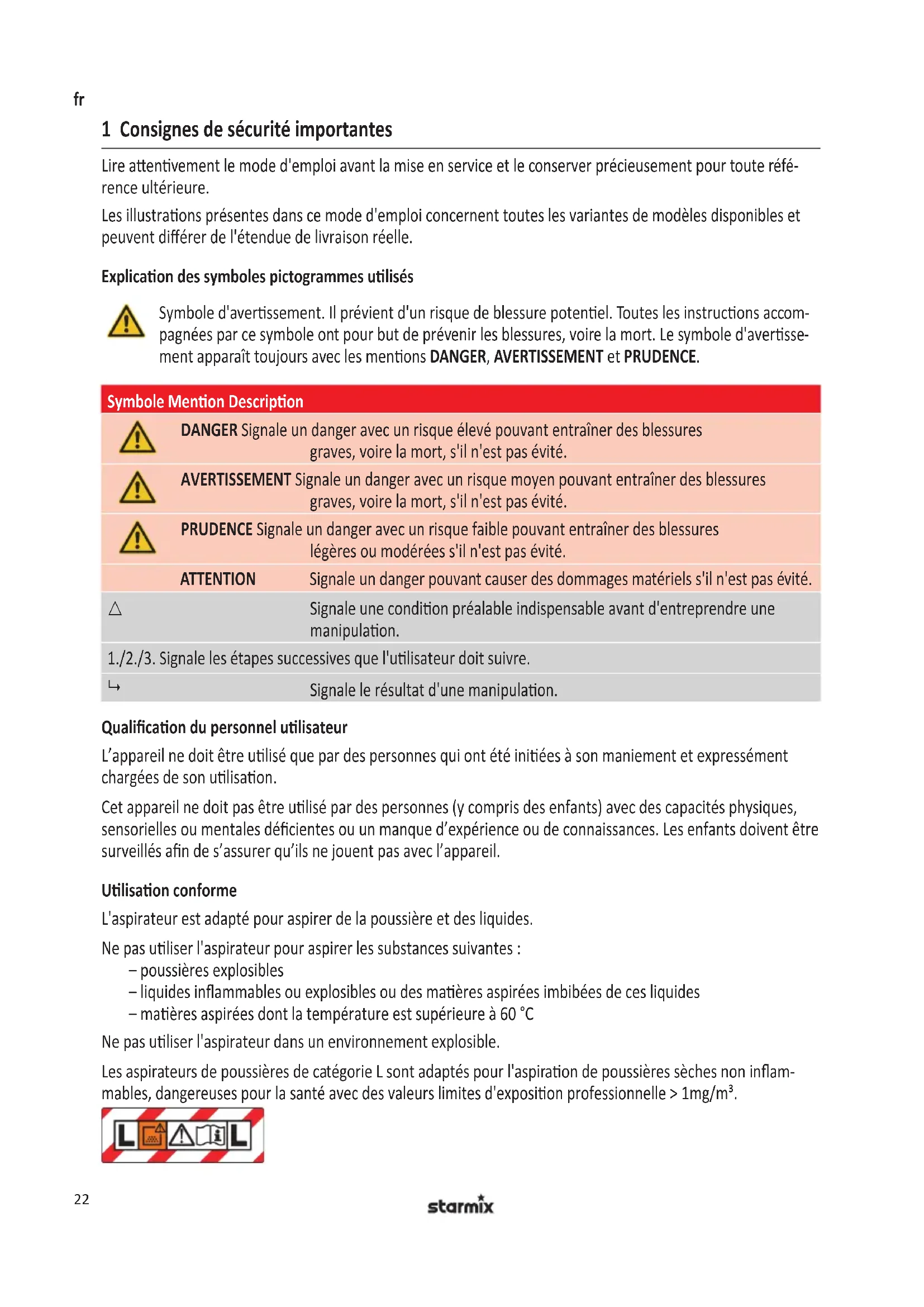 Les aspirateurs de poussières de catégorie L sont adaptés pour l'aspiration de poussières sèches non inflam-mables, dangereuses pour la santé avec des valeurs limites d'exposition professionnelle >1mg / m^3