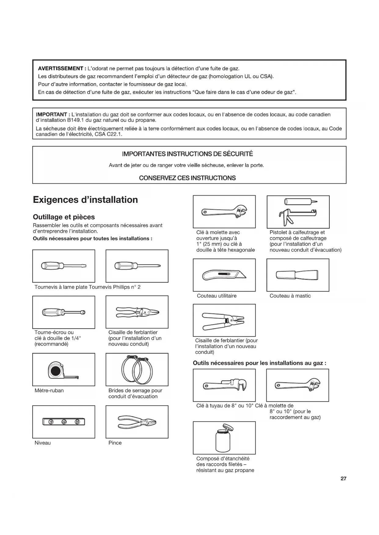 TROUBLESHOOTING See the Use and Care Guide or visit our website and reference Frequently Asked Questions to possibly avoid the cost of a service call.25 Sécurité de la sécheuse2627 Exigences d’installation Niveau Mètre-ruban Pince Tournevis à lame plate Tournevis Phillips n° 2 Clé à molette avec ouverture jusqu’à 1" (25 mm) ou clé à douille à tête hexagonale Cisaille de ferblantier (pour l’installation d’un nouveau conduit) Pistolet à calfeutrage et composé de calfeutrage (pour l’installation d’un nouveau conduit d’évacuation) Brides de serrage pour conduit d’évacuation Tourne-écrou ou clé à douille de 1/4" (recommandé) Couteau utilitaire Outillage et pièces Rassembler les outils et composants nécessaires avant d’entreprendre l’installation. Outils nécessaires pour toutes les installations : Couteau à mastic Outils nécessaires pour les installations au gaz : Clé à tuyau de 8" ou 10" Clé à molette de 8" ou 10" (pour le raccordement au gaz) Composé d’étanchéité des raccords letés – résistant au gaz propane Cisaille de ferblantier (pour l’installation d’un nouveau conduit)28 Pièces fournies Pieds de nivellement (4) (Longueur et l’apparence des pieds peuvent varier selon le modèle) Exigences d’emplacement Il vous faudra : ■ Un emplacement permettant une évacuation appropriée. Voir “Exigences concernant l’évacuation”. ■ Un circuit distinct de 15 ou 20 A est requis pour les sécheuses à gaz et un circuit distinct de 30 A est requis pour les sécheuses électriques. ■ Si on utilise un cordon d’alimentation, une prise électrique avec liaison à la terre située à moins de 2 pi (610 mm) de l’un des côtés de la sécheuse. Voir “Spécications électriques”. ■ Le plancher doit pouvoir soutenir le poids de la sécheuse de 200 lb (90,7 kg). Tenir également compte du poids des appareils voisins. ■ Un plancher de niveau avec une pente maximale de 1" (25 mm) sous l’ensemble de la sécheuse. Si l’inclinaison est supérieure à 1" (25 mm), installer l’ensemble de pieds d’extension de la sécheuse, pièce no 279810. Si la sécheuse n’est pas de niveau, les vêtements peuvent ne pas culbuter convenablement et les programmes de détection automatiques peuvent ne pas fonctionner correctement. ■ Pour une installation dans un garage, placer la sécheuse au moins 18" (460 mm) au-dessus du plancher. ■ Modèles avec génération de vapeur uniquement : Un robinet d’eau froide situé à 4 pi (1,2 m) maximum des valves de remplissage, et une pression d'eau de 20 à 100 lb/po2 (137,9 à 689,6 kPa). L’alimentation en eau de la laveuse peut être utilisée avec le connecteur en “Y” et le tuyau court fournis. IMPORTANT : Ne pas installer, remiser ou faire fonctionner la sécheuse à un emplacement où elle sera exposée à de l’eau, des intempéries ou à des températures inférieures à 45°F (7°C). À des températures inférieures, la sécheuse pourrait ne pas s’arrêter à la n des programmes de détection automatique, ce qui entraînerait le prolongement du temps de séchage. REMARQUE : Aucun autre appareil consommant un combustible ne doit être installé dans le même placard que la sécheuse. Le sachet de pièces se trouve dans le tambour de la sécheuse. Vérier que toutes les pièces sont présentes. Pièces fournies (modèles à vapeur) : Raccord en “Y” Tuyau d’alimentation court Tuyau d’alimentation de 5' (1,52 m) Rondelle en caoutchouc Pièces nécessaires (modèles à vapeur) : Pièces nécessaires : Consulter les codes locaux. Vérier l’alimentation électrique et le circuit d’évacuation existants. Voir “Spécications électriques” et “Exigences concernant l’évacuation” avant d’acheter les pièces. Les installations pour maison mobile nécessitent un système d’évacuation en métal qui peut être acheté chez le marchand chez qui vous avez acheté votre sécheuse. Pour plus d’information, veuillez consulter la section “Assistance ou service” de Guide d’utilisation et d’entretien de la sécheuse. Équipement facultatif : (Non fourni avec la sécheuse) Se référer au Guide d’utilisation et d’entretien pour des renseignements sur les accessoires disponibles pour la sécheuse. En cas d’utilisation d’un câble d’alimentation électrique : Utiliser un ensemble de câble d’alimentation électrique homologué UL marqué pour utilisation avec les sécheuses à vêtements. L’ensemble doit contenir : ■ Un câble d’alimentation électrique homologué UL de 30 ampères, 120/240 volts minimum. Le cordon doit être de type SRD ou SRDT et mesurer au moins 4 pi (1,22 m) de long. Les ls raccordés à la sécheuse doivent se terminer par des cosses rondes ou à fourche à pointes relevées. ■ Un serre-câble (homologation UL). ou29 Distances de dégagement à respecter : Pour chaque type de conguration, prévoir davantage de dégagement pour faciliter l’installation et l’entretien, laisser sufsamment de dégagement pour les appareils ménagers voisins et pour les murs, les portes et les plinthes. L’espacement doit être assez grand pour permettre d’ouvrir complètement la porte. Ajouter un espace supplémentaire tout autour de la sécheuse pour réduire le transfert de bruit. Si l’on installe une porte de placard ou une porte à persiennes, des ouvertures d’aération au sommet et au bas de la porte sont nécessaires. Vérier les exigences des codes. Certains codes limitent ou n’autorisent pas l’installation des sécheuses dans un garage, un placard, une maison mobile ou une chambre à coucher. Contacter l’inspecteur en bâtiment local. Dimensions de la sécheuse Vue avant A B A. Porte à large ouverture latérale B. Porte rabattable à large ouverture REMARQUE : La hauteur minimale des pieds de nivellement doivent être de 1/2" (13 mm), ou pour correspondre à la hauteur de la laveuse qui l’accompagne. Distances d’es