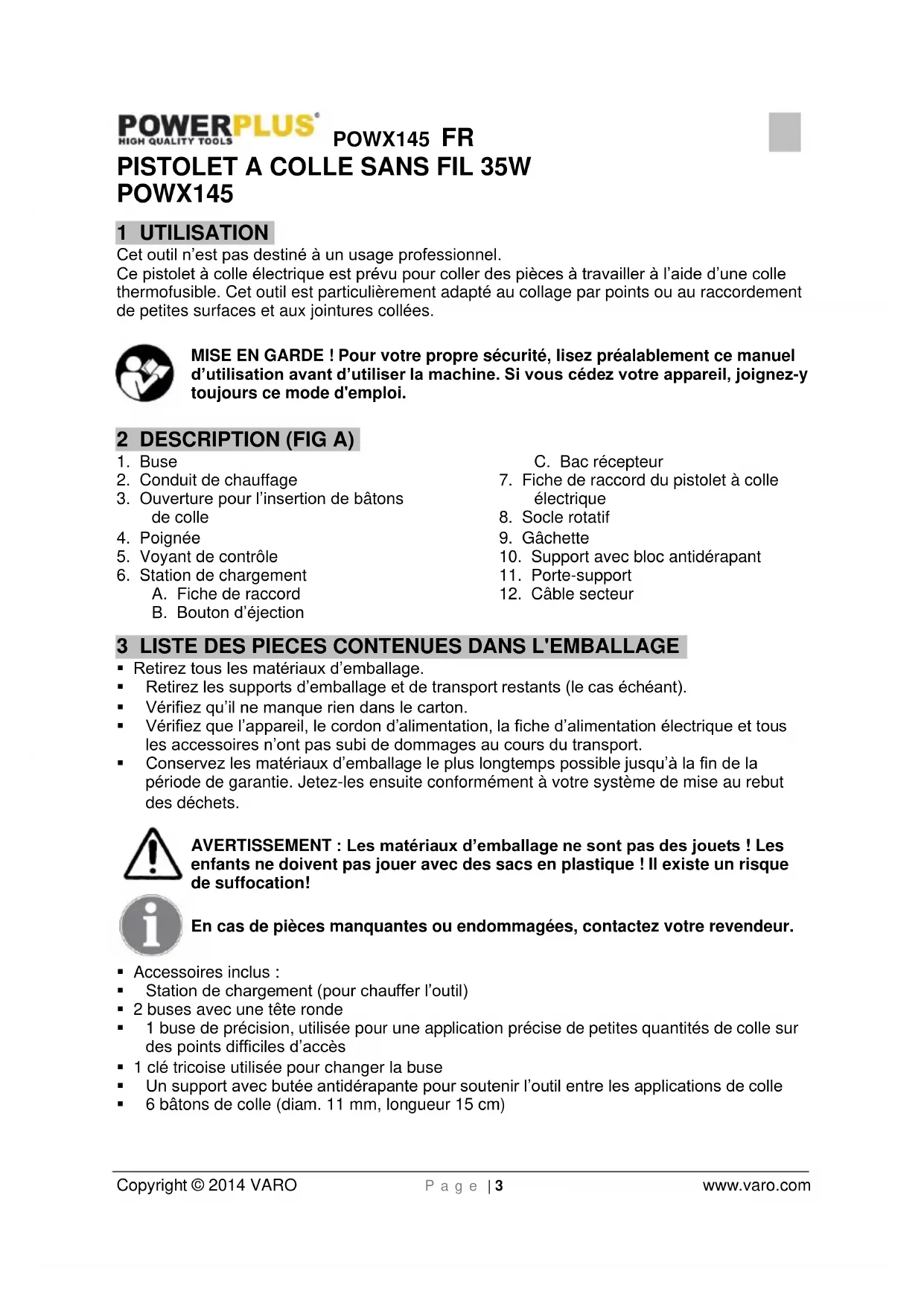 enfants ne doivent pas jouer avec des sacs en plastique ! Il existe un risque de suffocation! En cas de pièces manquantes ou endommagées, contactez votre revendeur. Accessoires inclus : Station de chargement (pour chauffer l’outil) 2 buses avec une tête ronde 1 buse de précision, utilisée pour une application précise de petites quantités de colle sur des points difficiles d’accès 1 clé tricoise utilisée pour changer la buse Un support avec butée antidérapante pour soutenir l’outil entre les applications de colle 6 bâtons de colle (diam. 11 mm, longueur 15 cm)POWX145 FR Copyright © 2014 VARO P a g e | 4 www.varo.com 4 PICTOGRAMMES Les symboles suivants sont utilisés dans ce mode d’emploi et/ou sur la machine :