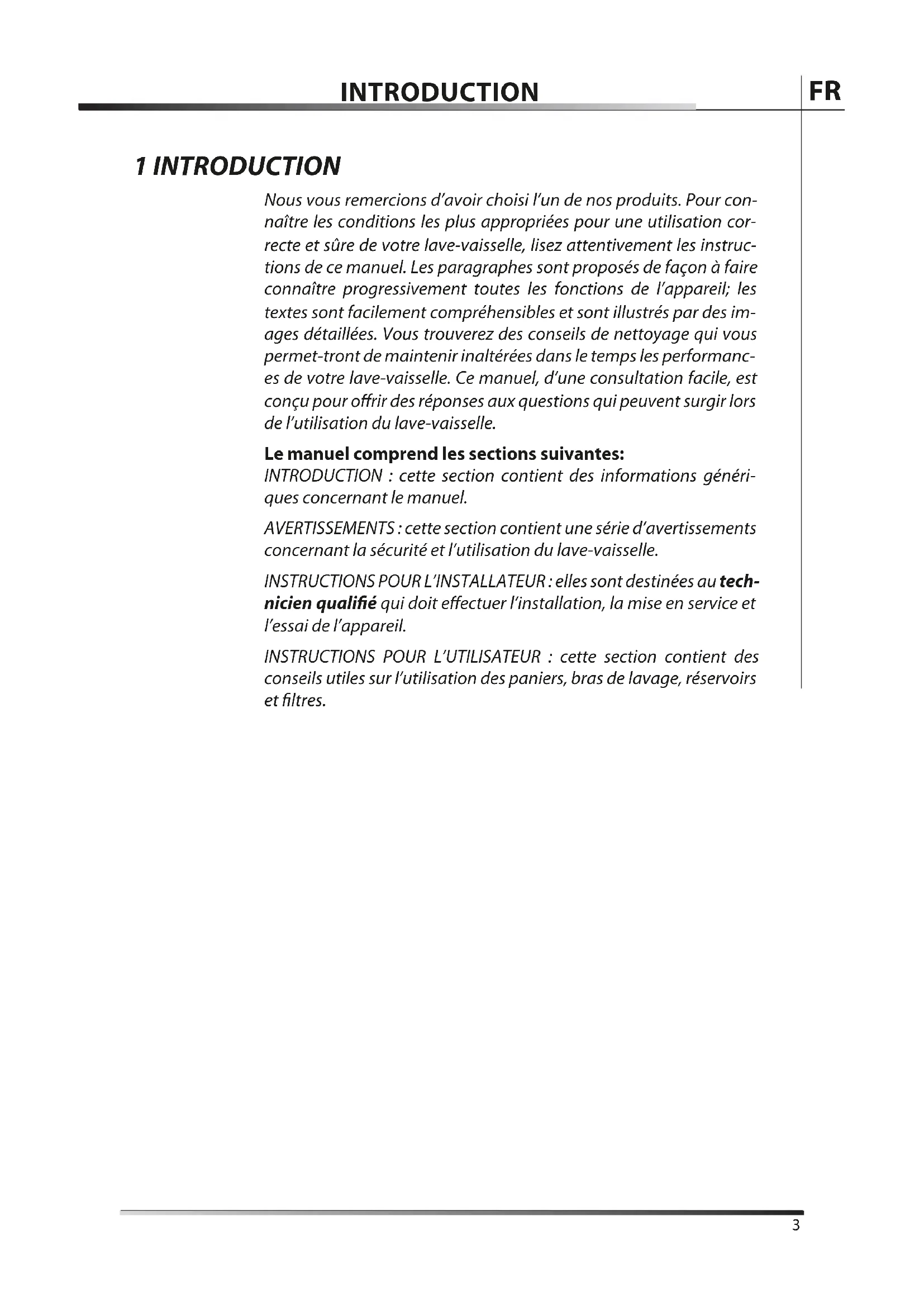 FR2 FR1 INTRODUCTION Nous vous remercions d’avoir choisi l’un de nos produits. Pour con- naître les conditions les plus appropriées pour une utilisation cor- recte et sûre de votre lave-vaisselle, lisez attentivement les instruc- tions de ce manuel. Les paragraphes sont proposés de façon à faire connaître progressivement toutes les fonctions de l’appareil; les textes sont facilement compréhensibles et sont illustrés par des im- ages détaillées. Vous trouverez des conseils de nettoyage qui vous permet-tront de maintenir inaltérées dans le temps les performanc- es de votre lave-vaisselle. Ce manuel, d’une consultation facile, est conçu pour offrir des réponses aux questions qui peuvent surgir lors de l’utilisation du lave-vaisselle. Le manuel comprend les sections suivantes: INTRODUCTION : cette section contient des informations généri- ques concernant le manuel. AVERTISSEMENTS : cette section contient une série d’avertissements concernant la sécurité et l’utilisation du lave-vaisselle. INSTRUCTIONS POUR L’INSTALLATEUR : elles sont destinées au tech- nicien qualifié qui doit effectuer l’installation, la mise en service et l’essai de l’appareil. INSTRUCTIONS POUR L’UTILISATEUR : cette section contient des conseils utiles sur l’utilisation des paniers, bras de lavage, réservoirs et filtres.